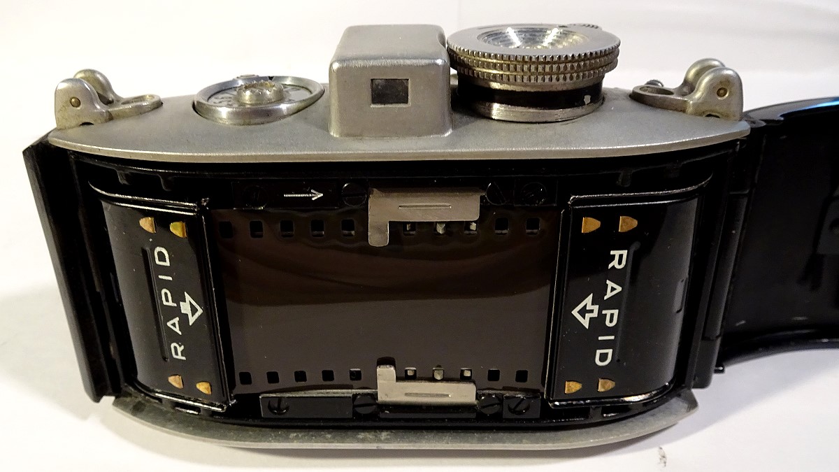 Übrigens noch ein Wort zu den Filmpatronen und dem Filmweitertransport. Beim-Rapid-System und dem Vorläufer in der Karat wird der Film nur durch die beiden Zahnräder am Rand der Filmführung vorangeschoben und dabei in die Rapid-Patrone gedrückt. Die Patronen werden anders als bei den normalen KB-Patronen nicht über ihre Innenachse angetrieben.