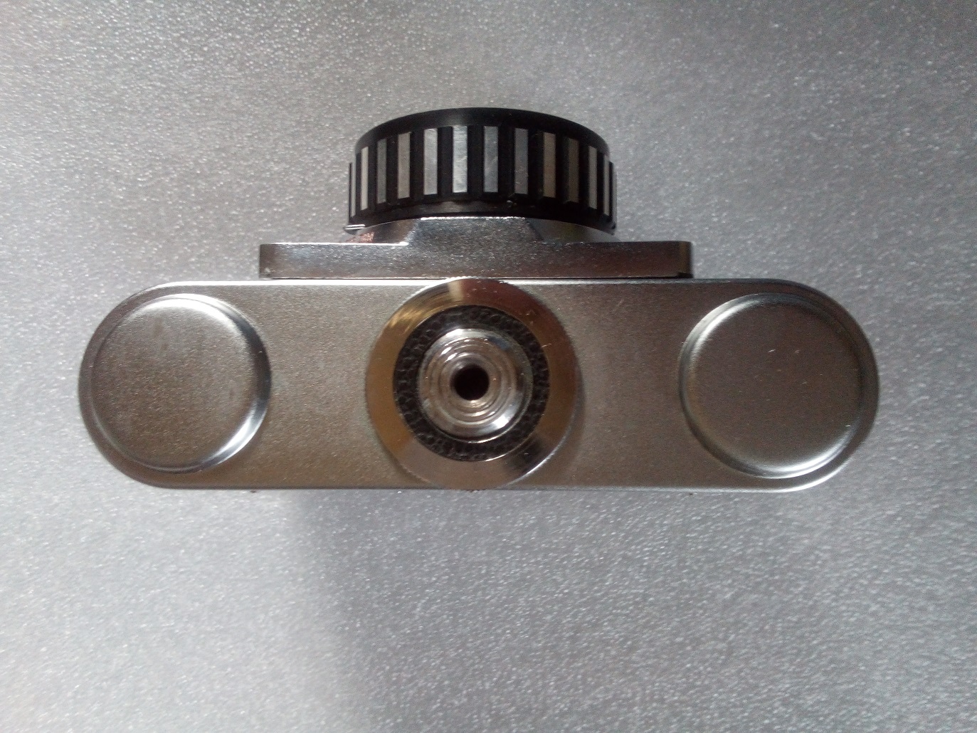 Interessant ist auch die Filmandruckplatte. Diese befindet sich nicht, wie bei den meisten Kameras, an der Rückwand sondern ist an der Kamera befestigt und muß beim Einlegen des Filmes umgeklappt werden.