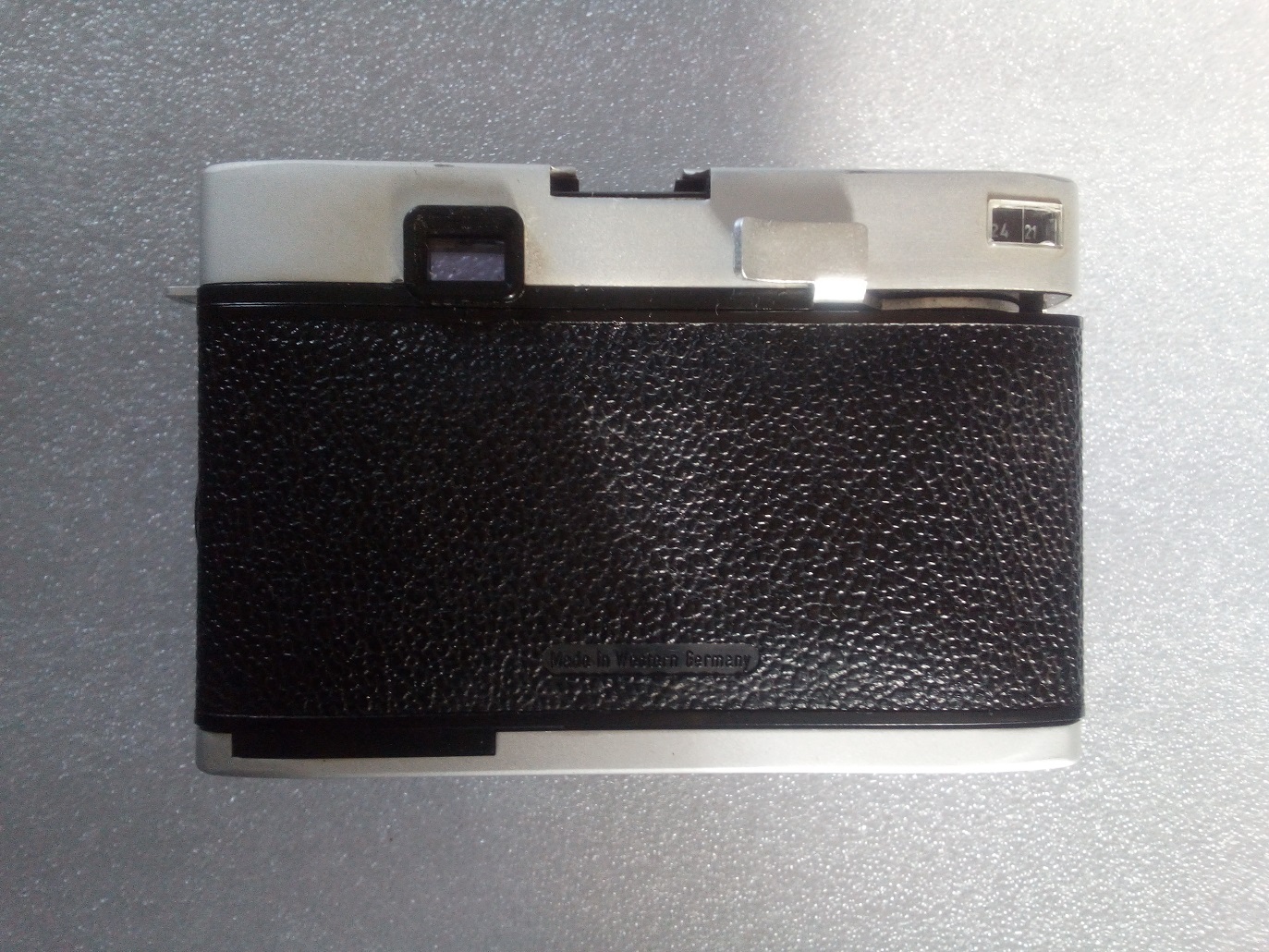 Rückseite: Sucher mit Leuchtrahmen, Parallaxmarken und Messnadel für den Belichtungsmesser, Schnellspannhebel, Bildzählwerk, klappbare Rückwand mit Filmandruckplatte