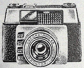 7) Dacora Dacora-matic 4D von 1960. KB-Sucherkamera, durch Drücken einer der vier Auslösetasten (nah, Portrait, Gruppe, unendlich) fand eine automatische Belichtung statt. Die Belichtungsautomatik steuert die Blende. Die Verschlußzeit der Kamera ist fest, abhängig von der gewählten DIN Einstellung.
