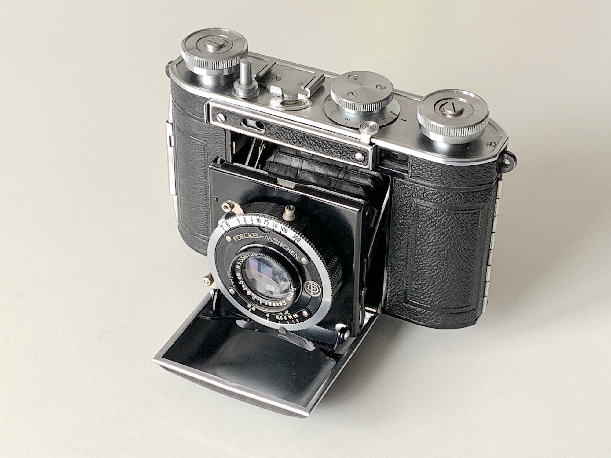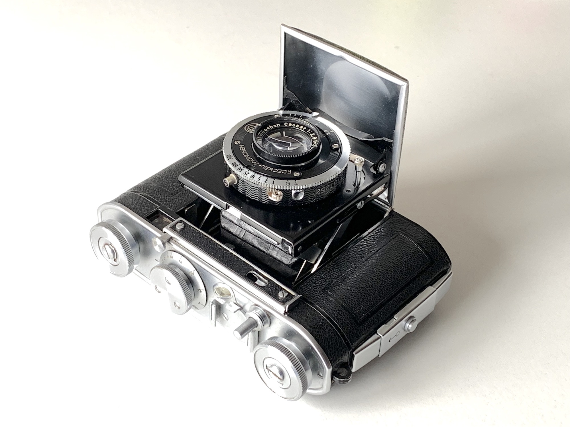 Das gezeigte Exemplar ist mit einem Steinheil Cassar 2,9/5 cm in 00-Compur 1/300 ausgestattet. Der Verschluss wurde nachträglich mit Synchronanschluss versehen. Die Kamera wurde 1936 für 75 RM angeboten.