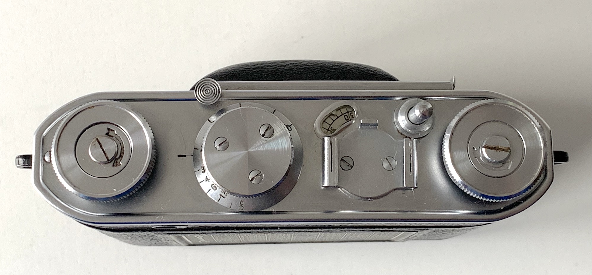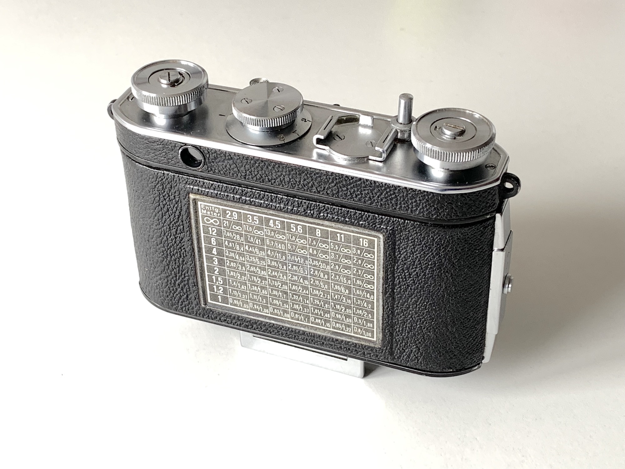 Ansonsten entspricht die Ausstattung der der Dollina 0. Es gibt einen Gehäuseauslöser, aber keine Mehrfachbelichtungssperre. Der Film wird von links nach rechts mit einem Drehknopf transportiert. Ein Knopf für die Transportfreigabe befindet sich normalerweise auf der Frontseite (beim gezeigten Exemplar fehlt er leider). Auf der Rückseite befindet sich eine Schärfentiefetabelle.