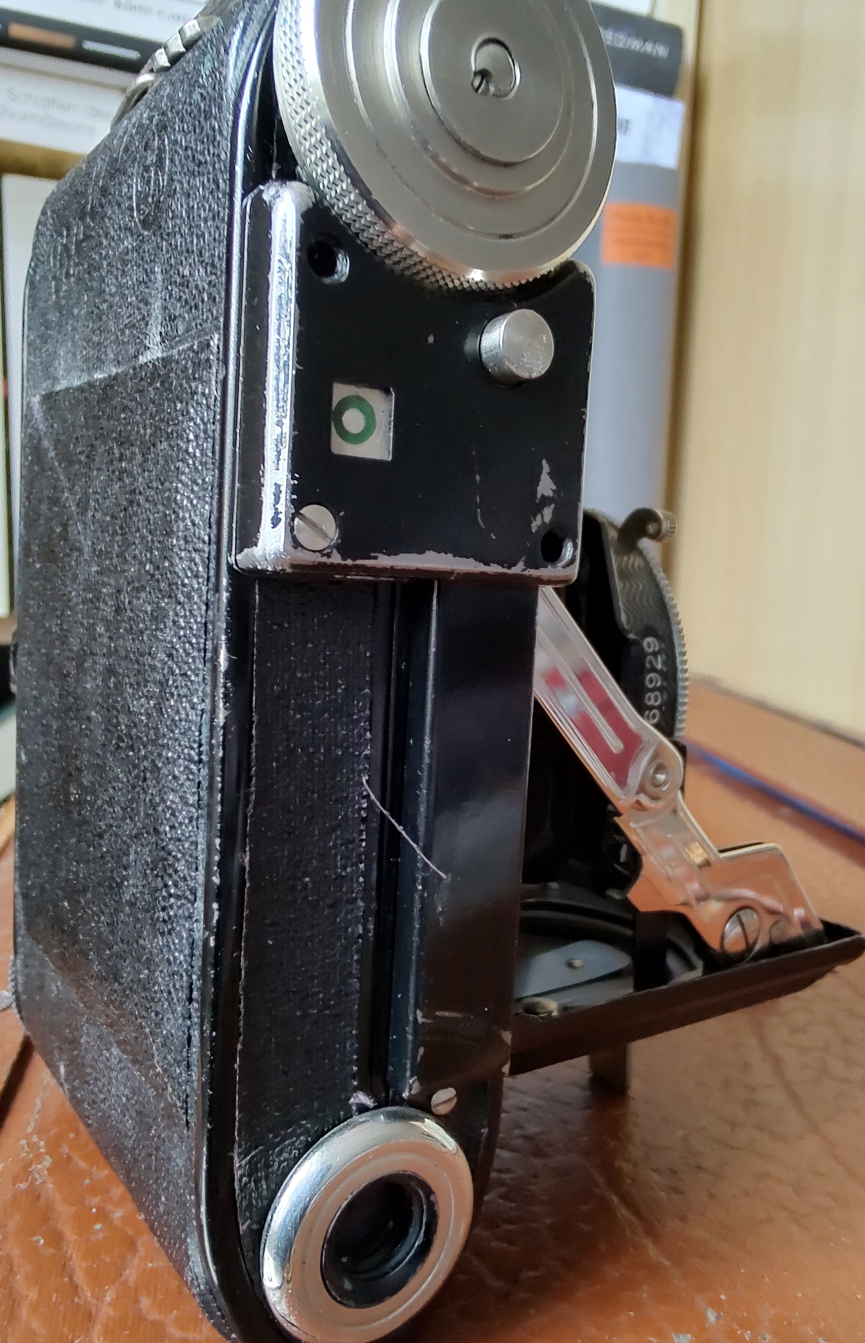 Sie war mir auf den zugehörigen Fotos aufgefallen, weil sie eine ganz ungewöhnliche Doppelbelichtungssperre hat, die ich noch nie bei einer Baldina oder einer anderen Balda-Kleinbildkamera gesehen habe. Normalerweise haben die Baldinas ja immer nur unten den Entriegelungsknopf, nach dessen Betätigung man den Film für die nächste Aufnahme weitertransportieren kann (ähnlich wie bei den KB-Weltas). Hier gibt es aber nun einen richtigen zweiteiligen "Anbau". Muss der Film weitertransportiert werden, erscheint ein rotes E. Ist der Filmtransport mittels der Rändelschraube erfolgt, wird dies durch einen grünen Kreis angezeigt. Nach dem Auslösen springt die Anzeige automatisch wieder auf E. Das Ganze sieht sehr professionell gemacht aus und nicht nach einer Eigenkonstruktion. Gab es so etwas von Balda als Zusatzgerät? Ist Dir das sonst schon einmal untergekommen? Vielleicht gibt es darauf ja eine Antwort.