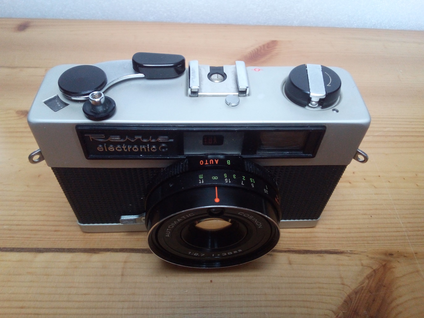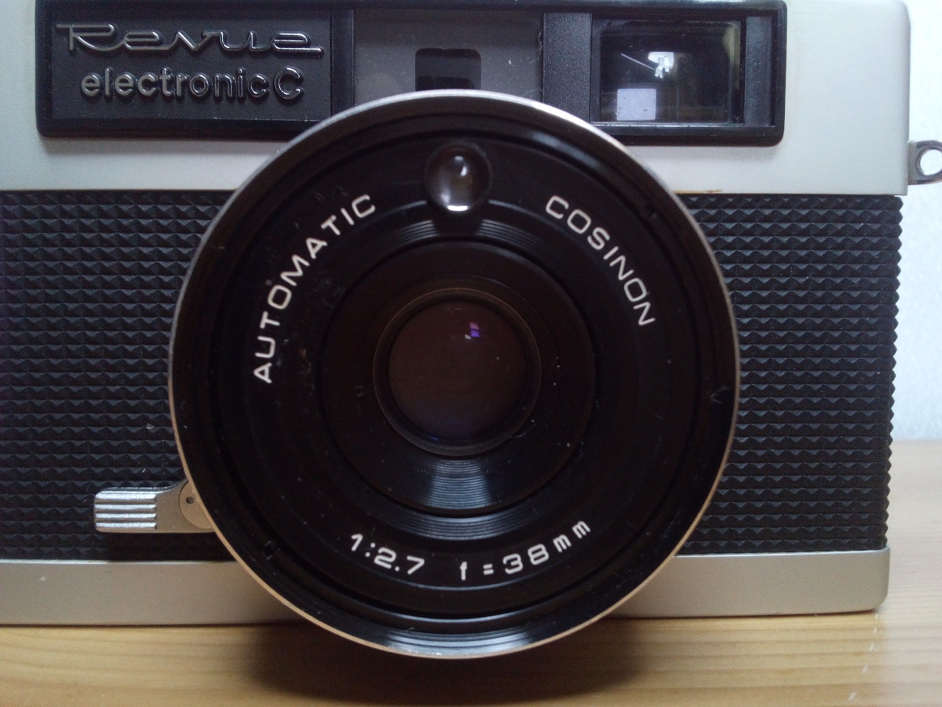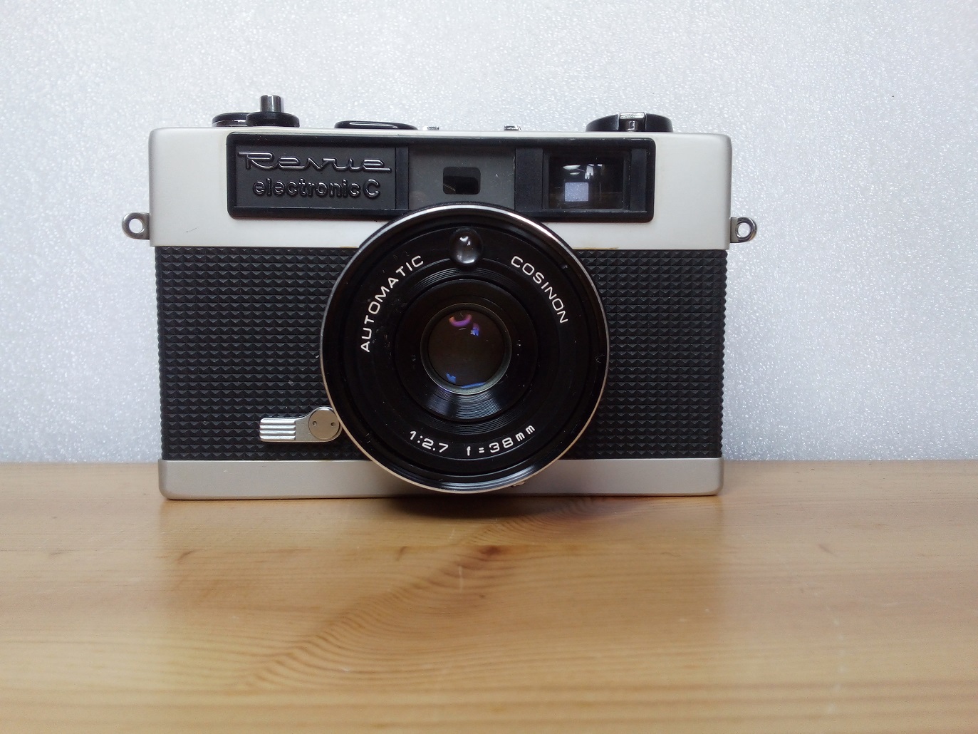 Vertrieb / Hersteller: FOTO QUELLE / COSINA, Japan Modell: Revue electronic C (COSINA 35) Baujahr: 1971 Seriennummer: 1313370 Typ: KB-Sucherkamera 24 x 36 mm mit batteriegestützter Belichtungsmessung und automatischer Blenden- und Zeiteinstellung (im Automatikmodus), eingespiegelte Werte und Parallaxenmarken Verschluß: COPAL, "B", 1/30 - 1/650 sec, Blitzmodus 1/25 sec, Selbstauslöser Blenden: 2,7 - 16 Objektiv: AUTOMATIC COSINON, 1:2,7 / 38 mm, farbkorrigierter Vierlinser Fokussierung: manuell (gekoppelter Entfernungsmesser) 1m - unendlich Preis (1972): 199,-- DM