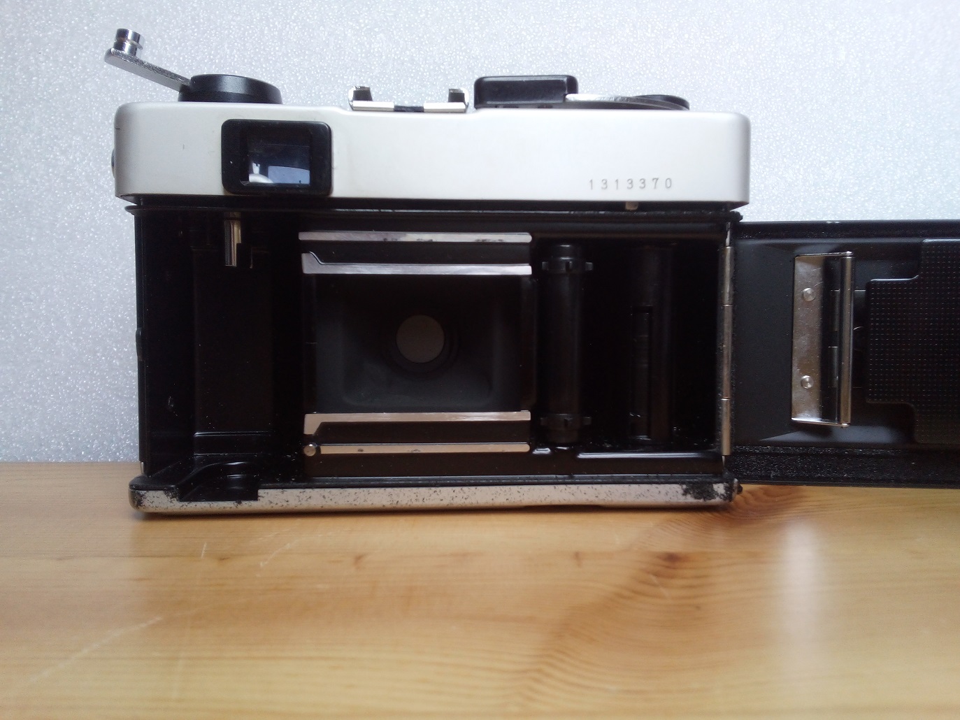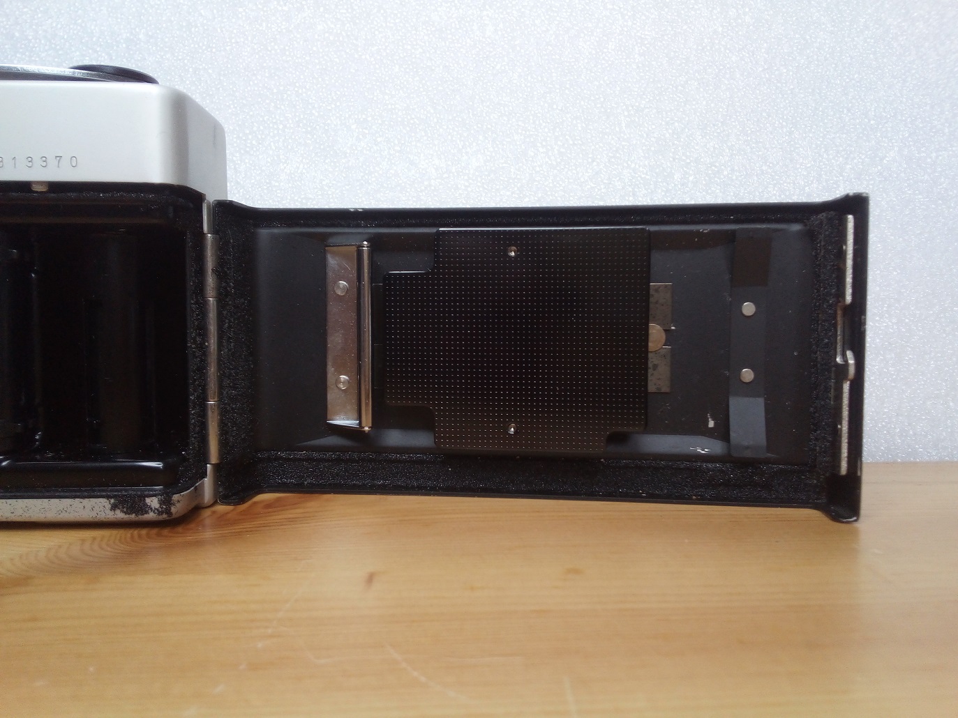 Rückseite: Sucher mit Einspiegelungen, aufklappbare Rückwand mit Filmandruckplatte