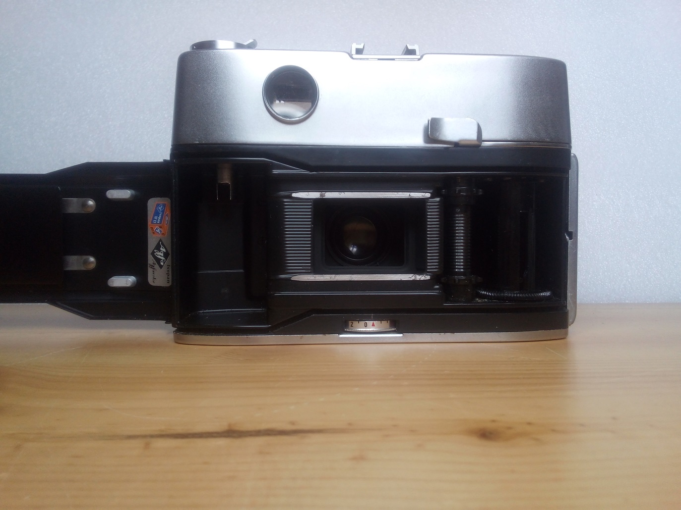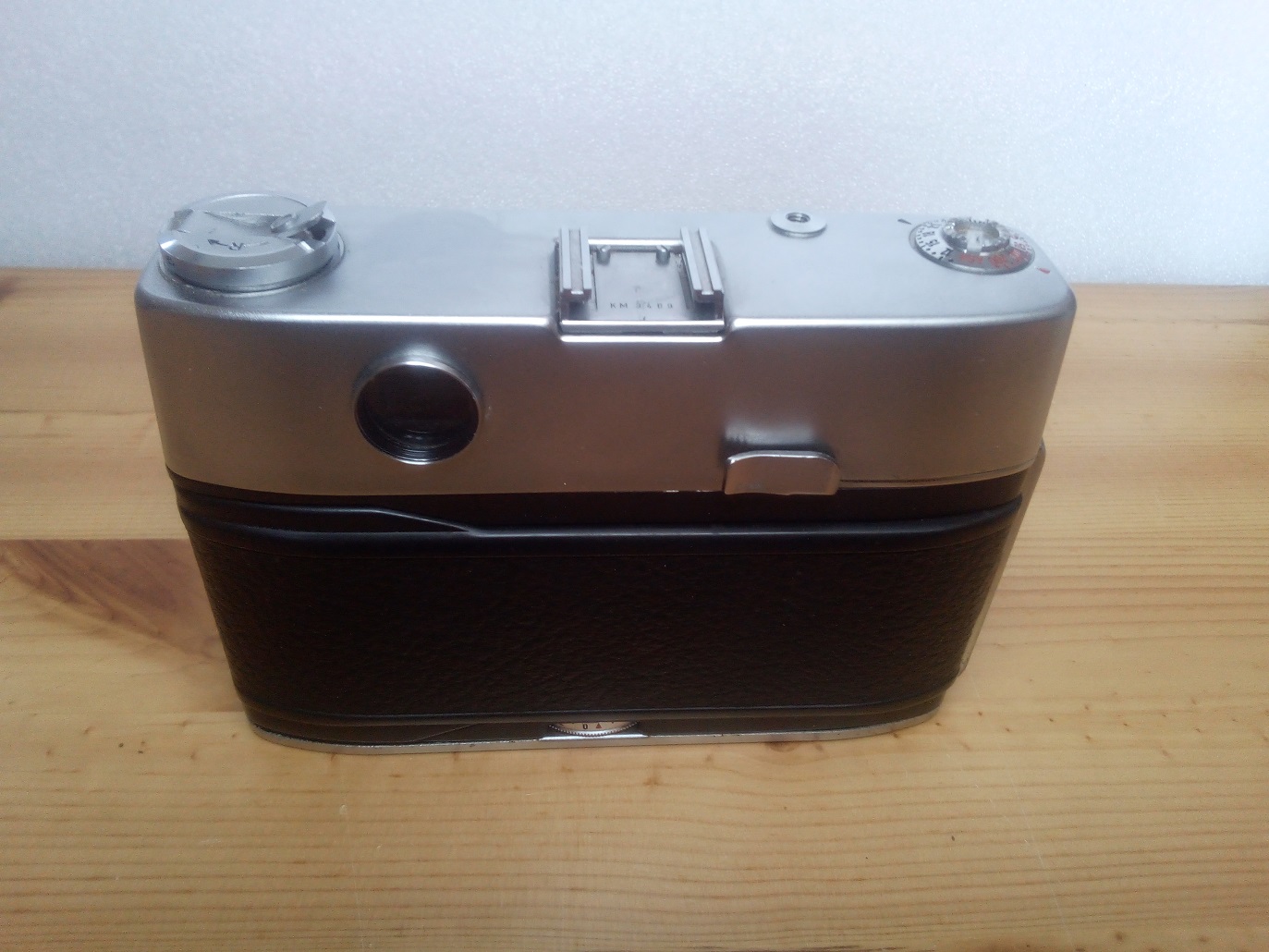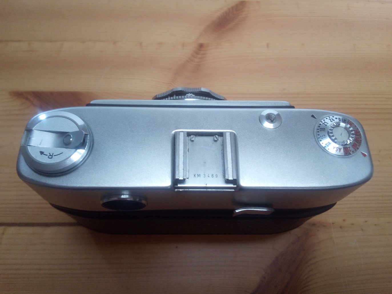 Oberseite: Filmrückspulkurbel, Blitzschuh ohne Mittenkontakt (PC-Buchse unten rechts vorne am Gehäuse) Drahtauslöseranschluß, Einstellrad für die Filmempfindlichkeit