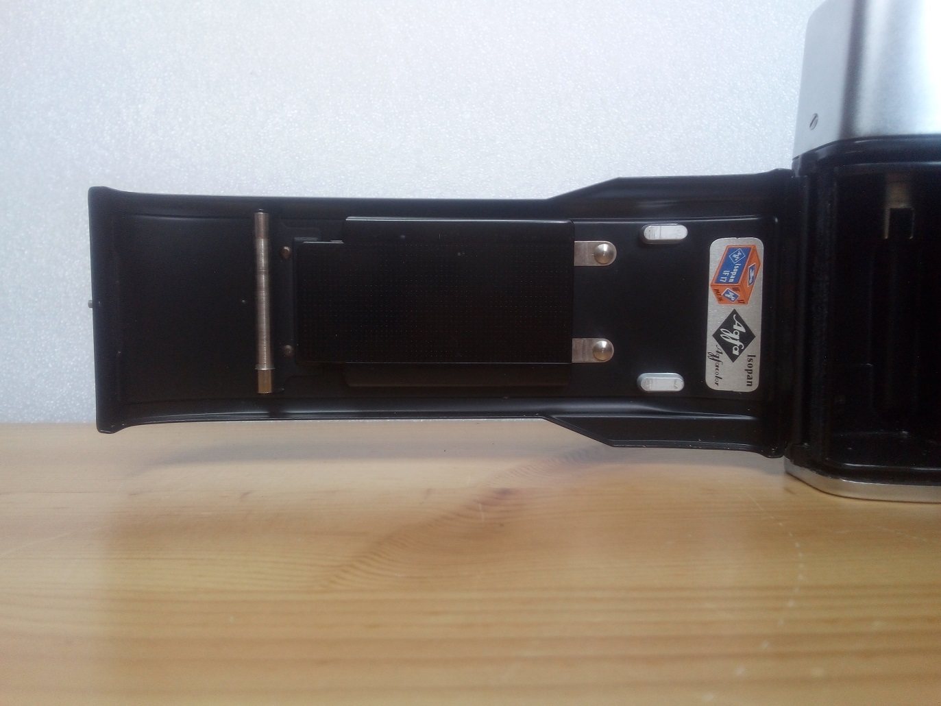 Rückseite: Sucher mit Parallaxenmarken, rot - grün und Blendenwerteinblendung, Schnellspannhebel, klappbare Rückwand mit Filmandruckplatte, Filmzählwerk.