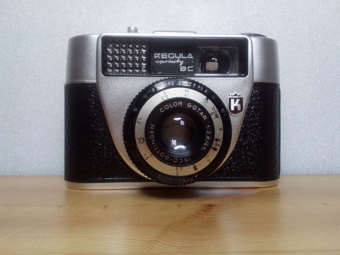 Hersteller: Regula-Werk King KG, Bad Liebenzell / Schwarzwald Modell: Regula sprinty BC Baujahr: 1970er Jahre Typ: KB-Sucherkamera mit Leuchtrahmensucher, Parallaxmarken und ungekoppeltem Belichtungsmesser (Selenzelle), 24 x 36 mm, max 36 Aufnahmen Verschluß: RECTAMAT, "B", 1/30 - 1/250 sec mit Blenden in Gruppen zusammengefasst, Blenden: 2,8 - 16 Objektiv: ISCO-GÖTTINGEN COLOR GOTAR 1:2,8/45 mm Fokus in Meter und Fuß 1 Meter (3,3 ft) - unendlich Filmempfindlickeit: 12 - 27 DIN ( 12 - 400 ISO)