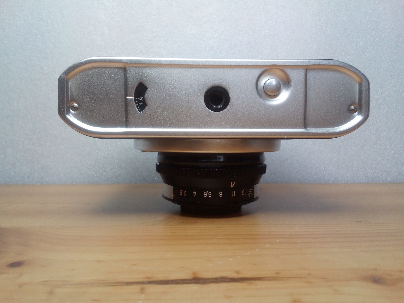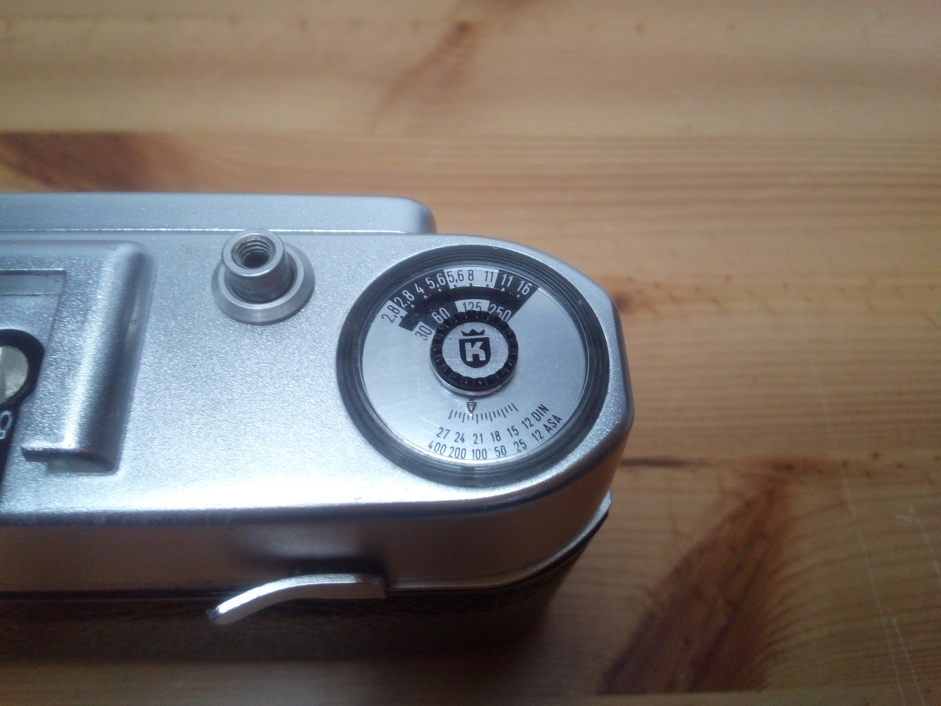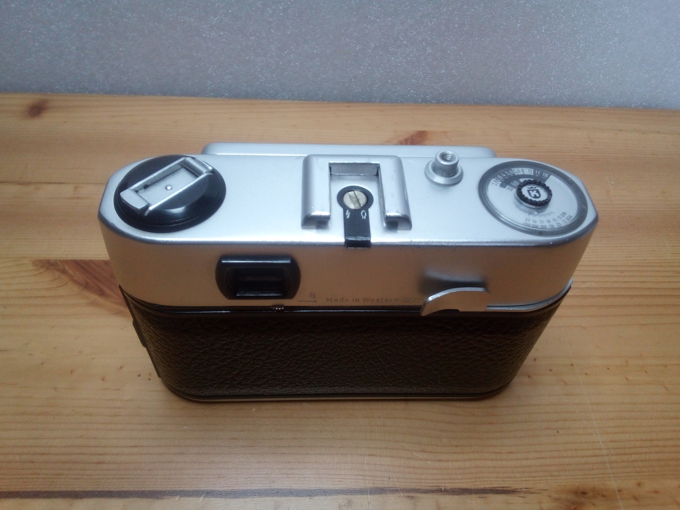 Oberseite: Filmrückspulkurbel, Blitzschuh mit Mittenkontakt und Einstellung für Elektronenblitz oder Blitzbirnchen, Auslöser mit Drahtauslöseranschluß, Anzeige des Belichtungsmessers