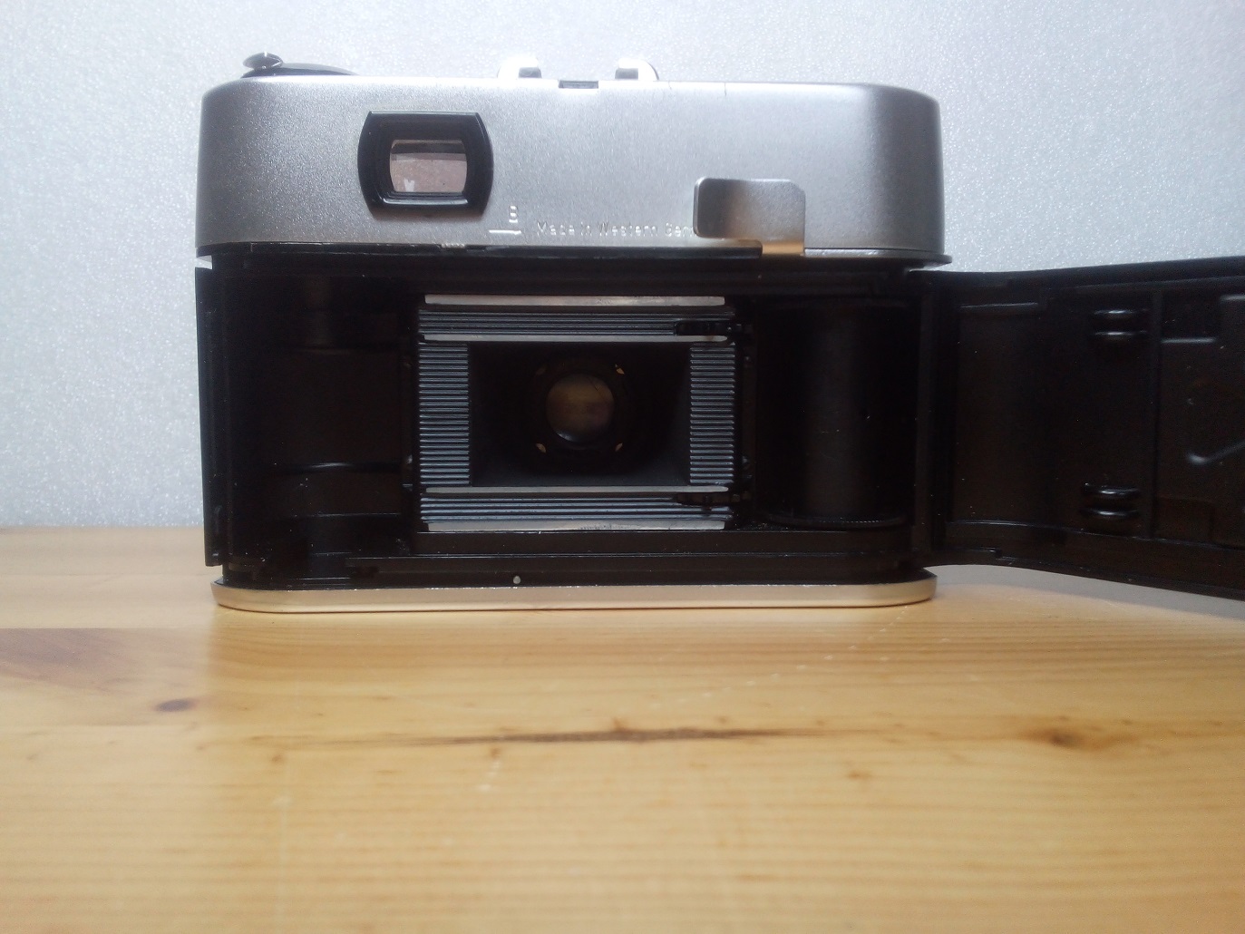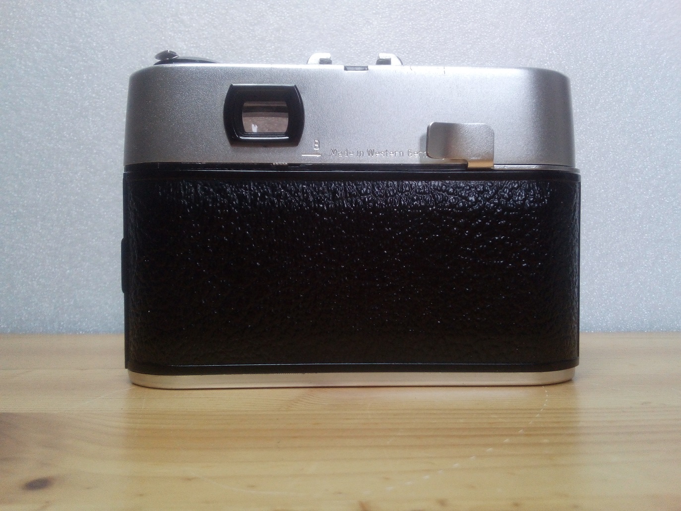 Rückseite: Sucher mit Leuchtrahmen, Parallaxmarken, Hebelchen für "B" Modus, Schnellspannhebel, klappbare Rückwand mit Filmandruckplatte