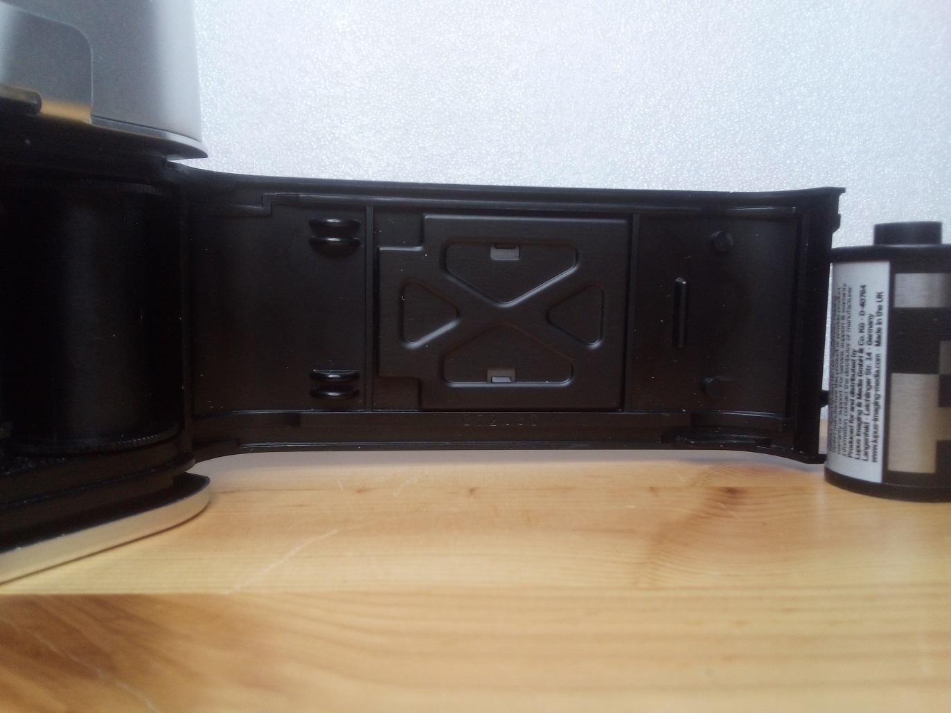 Unterseite: Entsperrknopf für die Filmrückspulung, Stativgewinde, Bildzählwerk