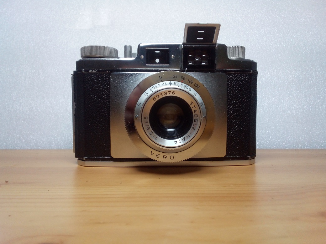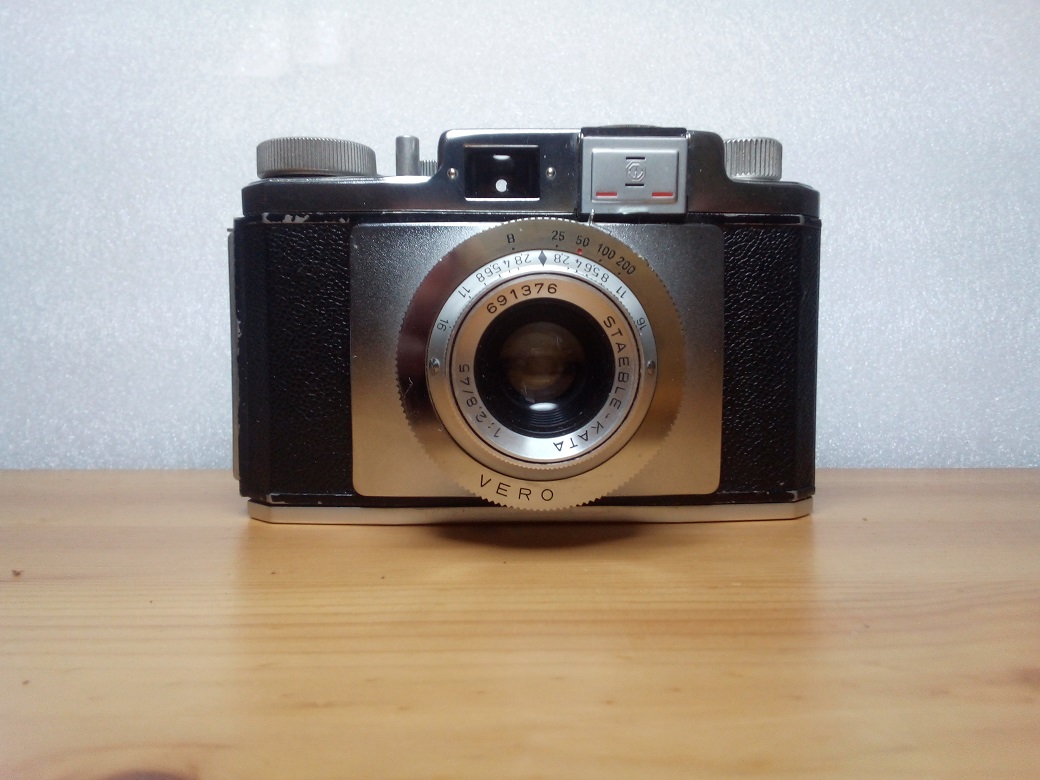 Hersteller: Carl Braun Kamera-Werke, Nürnberg Modell: Gloriette B Typ: KB-Sucherkamera mit ungekuppeltem Selenzellen-Belichtungsmesser, 24 x 36 mm Baujahr: 1956 Verschluß: VERO, "B", 1/25 - 1/200 sec. Blenden: 2,8 - 16 Objektiv: STAEBLE-KATA 1:2,8/45, Seriennummer 691376 Fokus: 1m - unendlich Neupreis (1956): 129,-- DM