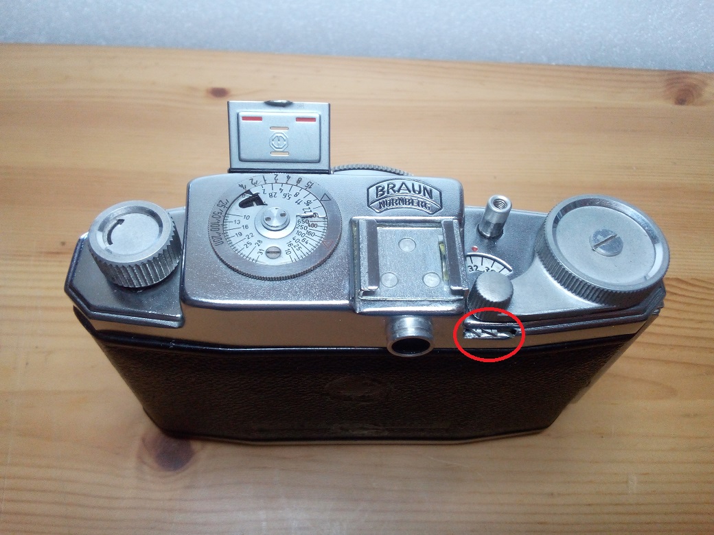 Die Kamera weiß mit ein paar Besonderheiten aufzuwarten: So wird z. B. das Filmzählwerk mit einem an das Sägeblatt einer Kreissäge erinnernden Zahnrad, welches sich unterhalb des Schnellspannhebels befindet, zurück gestellt (siehe Markierung auf Bild 3). Der Verschluß wird (wie von einigen Voigtländer Kameras bekannt) nur bei eingelegtem Film über einen Zahnradeingriff gespannt. Am Ungewöhnlichsten ist sicherlich, dass der Auslöser auch gleichzeitig als Entsperrung für die Filmrückspulung dient.