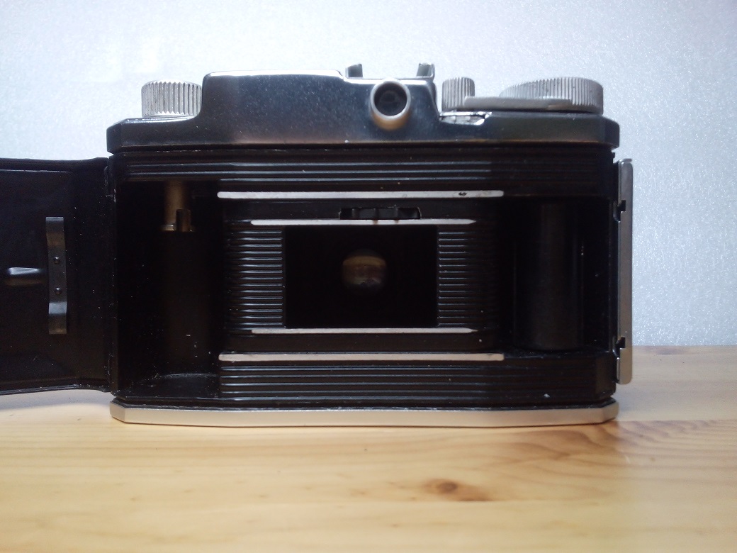Rückseite: Sucher, klappbare Rückwand mit Filmandruckplatte