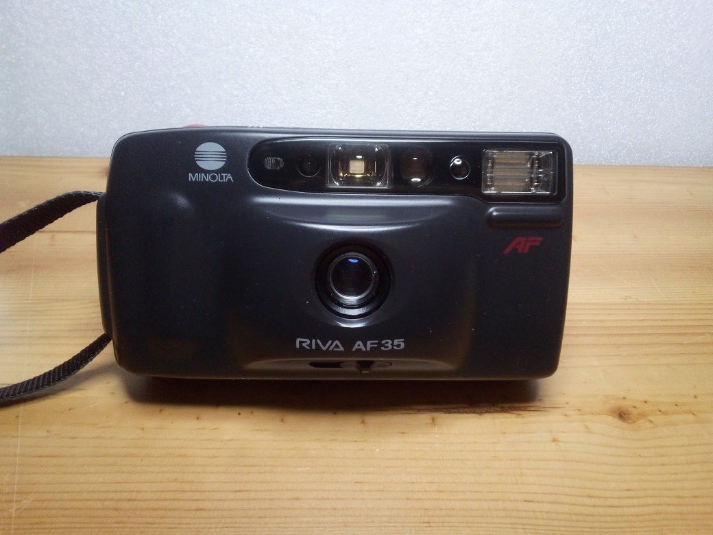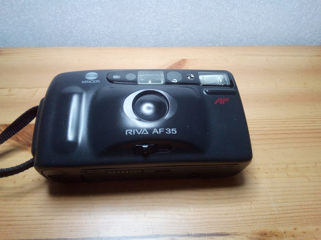 Hersteller: Minolta, Japan Modell: Riva AF 35 Typ: vollautomatische KB-Sucherkamera, 24 x 36 mm mit DX-Kodierung 100 und 400 ISO Baujahr: 1991 Seriennummer: 00249303 Verschluß:? Blenden:? Objektiv: 1:4,5 /35 mm Fokus: automatisch ab 0,95 Meter Gewicht. ca. 225 Gramm (ohne Film und Batterien) Stromversorgung: 2 x 1,5 Volt AA Batterien
