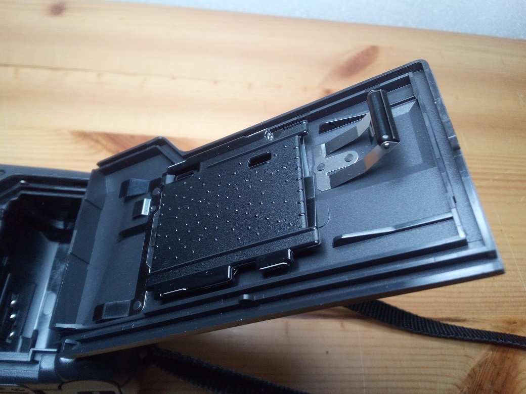 Rückseite: Sucher mit Parallax-Marken und grüner LED für Blitzbereitschaft, aufklappbare Rückwand mit Filmandruckplatte