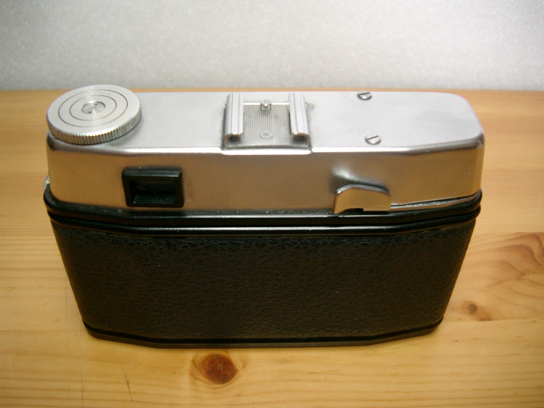 Oberseite: Filmrückspulrad, Blitzschuh ohne Mittenkontakt ( PC-Buchse vorne links an der Objektivplatte)