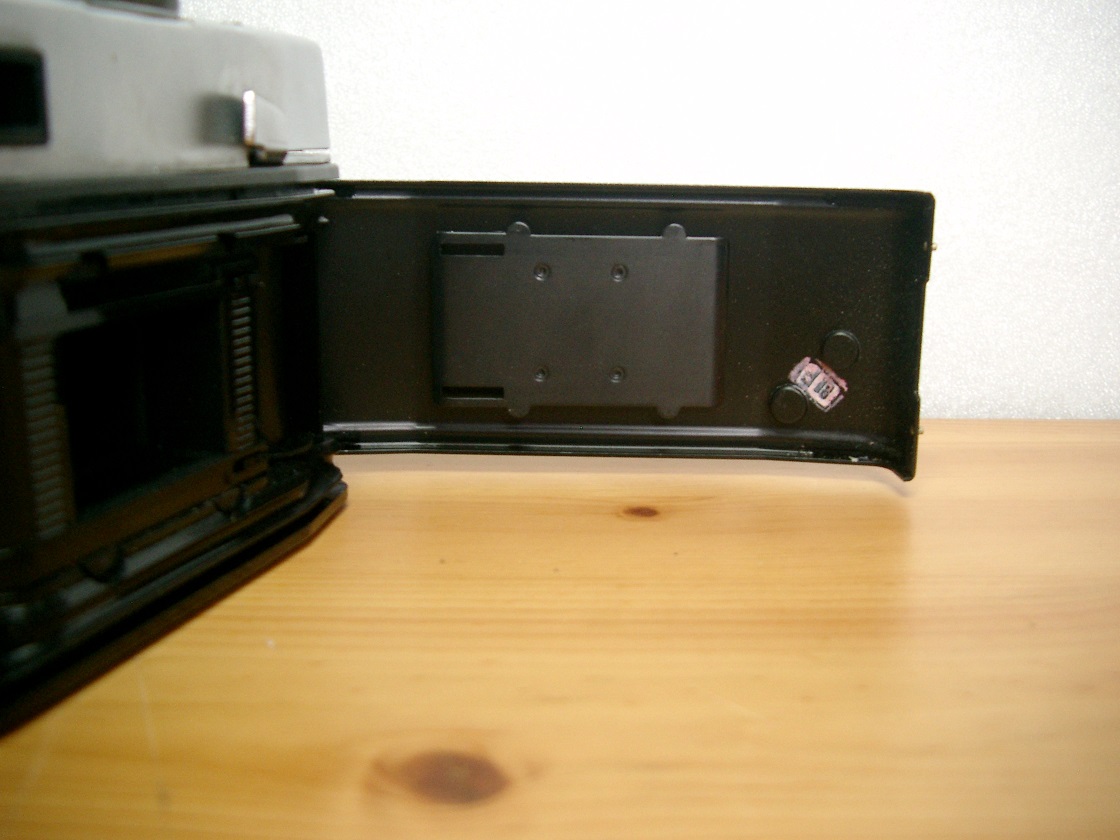 Unterseite: Seriennummer, Stativgewinde, Entsperrknopf für die Filmrückspulung, Bildzählwerk mit automatischer Rückstellung