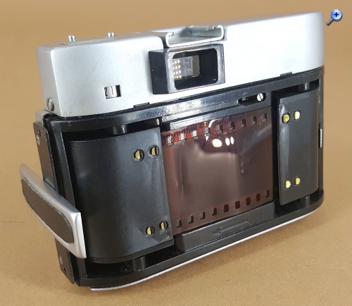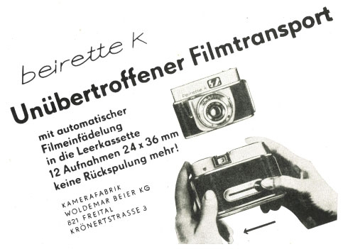 Aber zunächst ein paar Worte zur „Beirette k“, dem Ursprung der Beirette KF: Die Beirette k wurde auf der Jubiläumsmesse im März 1965 in Leipzig vorgestellt und ging ab Mai 1965 in die Serienproduktion. Die Zeitschrift „Photo-Technik und Wirtschaft“ schrieb dazu: „In Zusammenarbeit mit dem VEB Filmfabrik Wolfen demonstrierte die Kamerafabrik Woldemar Beier KG, daß eine Kleinbildkamera für Karat-Patronen die Verwendung von Rapid-Filmen nicht ausschließt […] In konstruktiver Hinsicht bisher ohne Parallele ist der Filmtransport an der Rückseite der Kamera […]“.