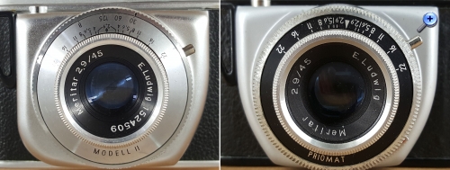 Bild links: eine zeitgenössische Werbung der Beirette kf, Bild rechts: meine hier vorgestellte Modellvariante Beirette kfs (unterschiedliche Objektivfüße)