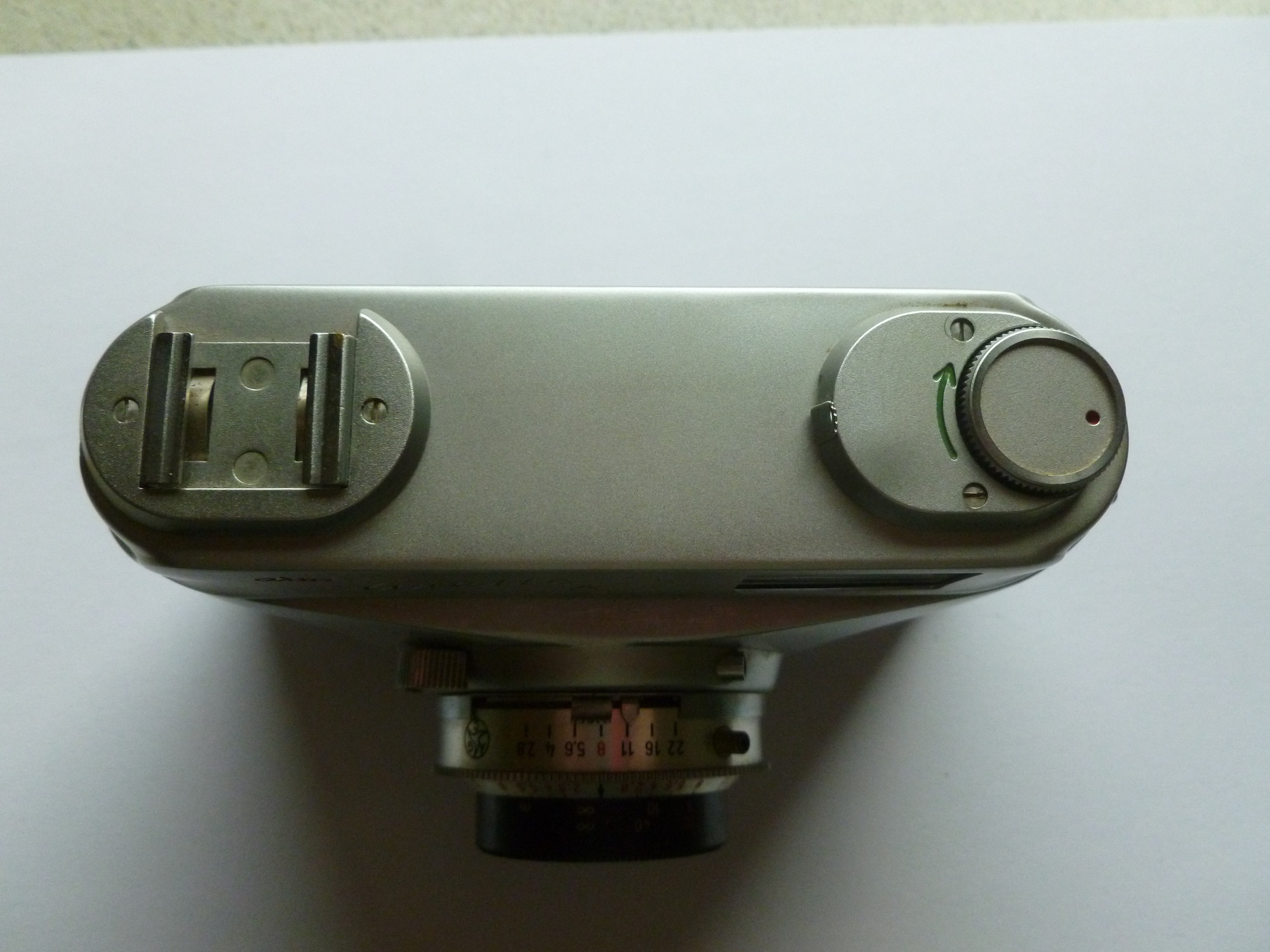 Typ: 35 mm Rollfilmkamera/Sucherkamera Sucher: einfach 12x 18 mm Schnellschalthebel am Boden Filmzählwerk am Boden Schnellschalthebel und Auslöser nicht beledert das könnte aber ein Lagerschaden sein Kein Entsperrknopf zum zurückspulen Objektiv: Isco Isconar 1:2,8 x 45 Beschriftung in mtr. und feet Verschluss: Pronto B 30 60 125 250 wahrschein mit Selbstauslöser, aber rührt sich nichts mehr Filmtransport: 2 Stachelwalzen mittig Aufwickelspule: 7 mm Nr. des Gehäuses 280021
