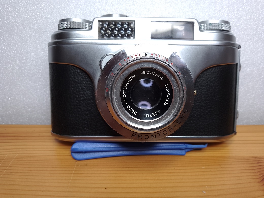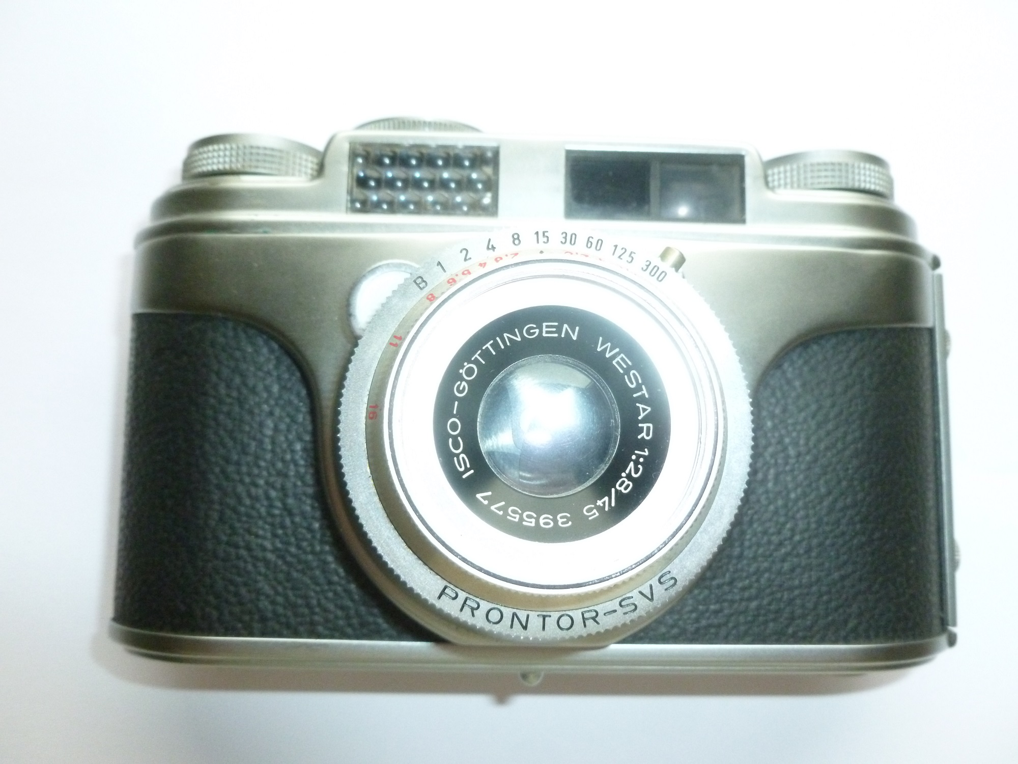 Kleinbildkamera füe Film 135 24x36 mm Baujahr ab 1956 Seriennummer 96796 Kadlubek AKA 0170 Objektiv Isco Westar 1:2,8 x 45 Blende bis 16 Festanschluss Seriennummer 395577 Entfernungseinstellung ab 1 mtr. eingebauter Belichtungsmesser Gossen Verschluss Prontor SVS bis 1/300 Blitzumstellung V X M Drahtauslöseranschluss Schnellschalthebel mit integriertem Lösehebelchen Bedienknöpfe chariert Leuchtrahmensucher Merkscheibe ASA/DIN über Belichtungsmesser (aber nur Merkscheibe) Verstellung am Boden Filmzählwerk am Boden keine Transportösen kleines und großes Stativgewinde sehr guter Stand durch Dreipunktauflage