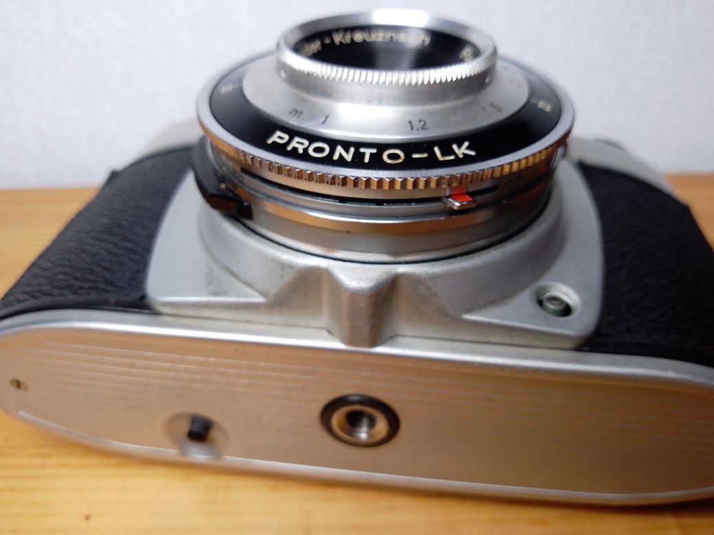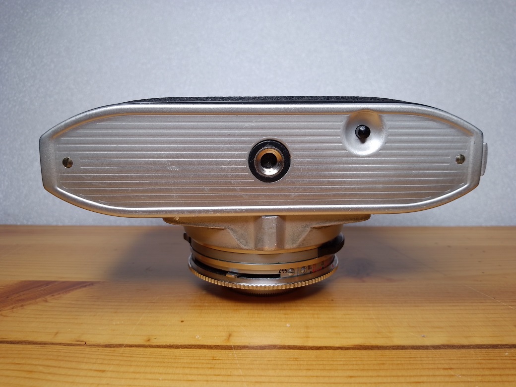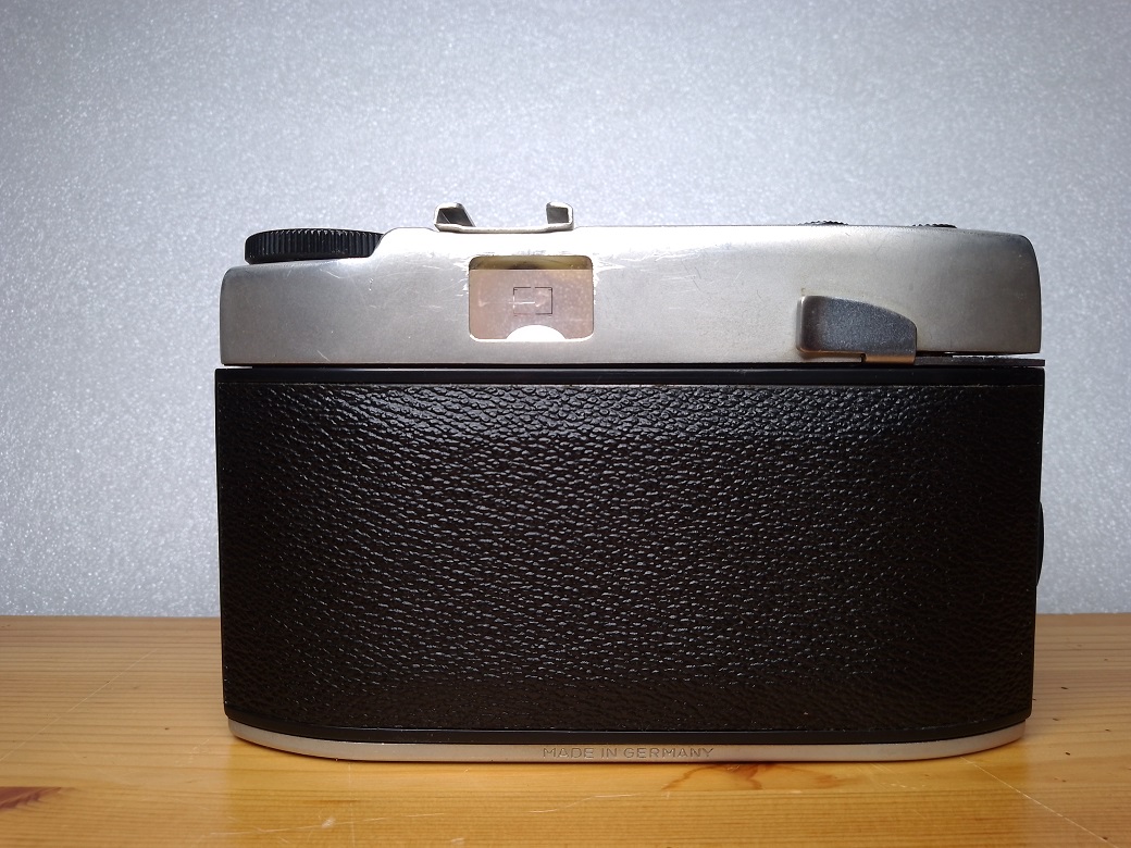 Oberseite: Filmmerkscheibe, Blitzschuh ohne Mittenkonakt (PC-Buchse vorne links unten an der Alu-Blende), Anzeige für den Belichtungsmesser, Auslöser aus Kunststoff mit Drahtauslöseranschluß, Einstellrädchen für das rückwärtszählende Bildzählwerk (nicht selbst rückstellend)