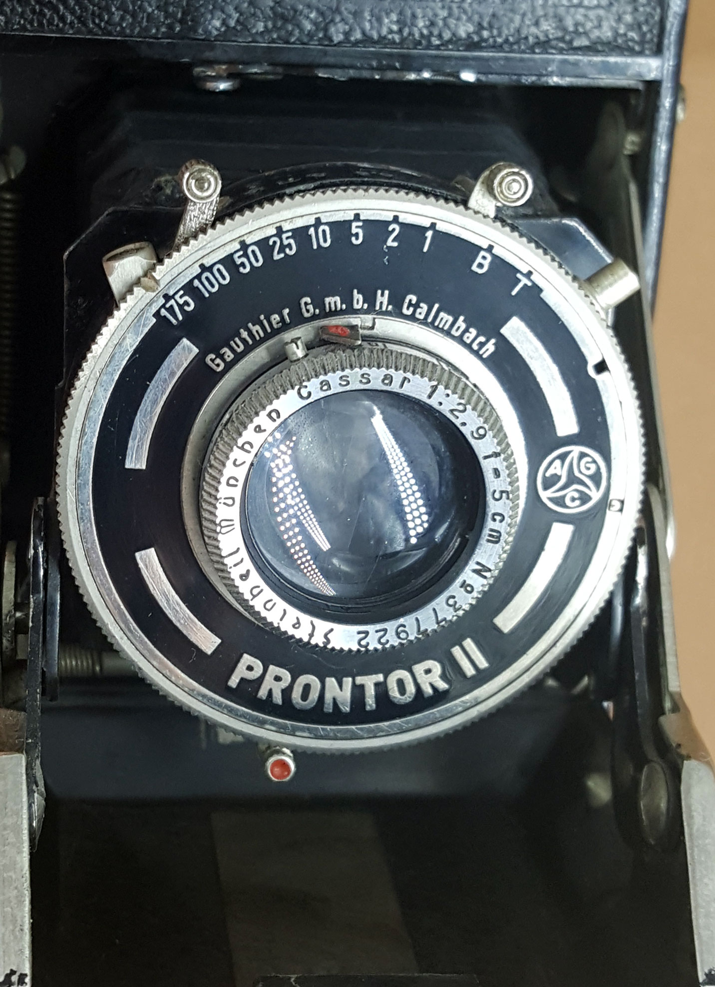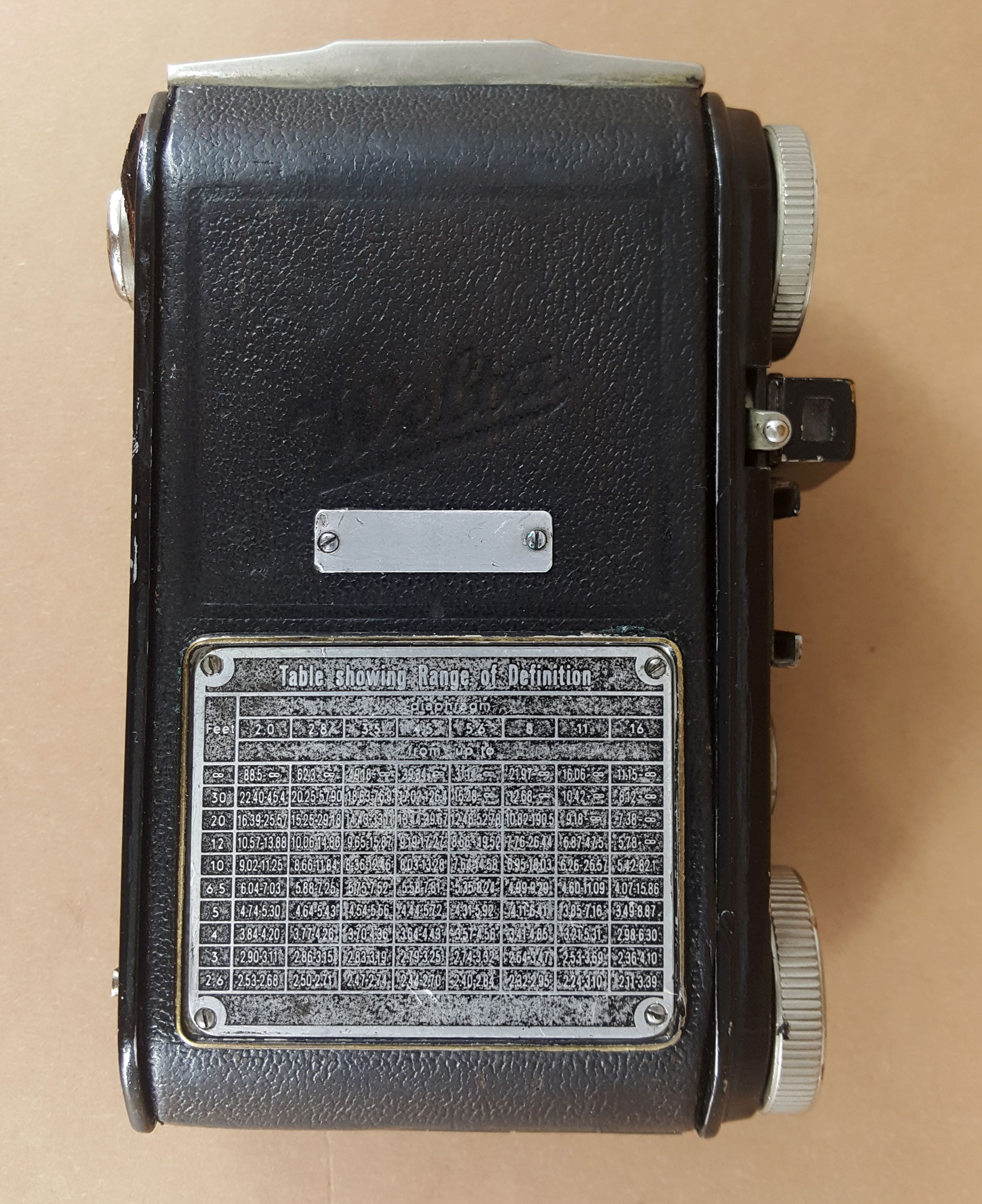 Das hier vorgestellte Exemplar ist ein älteres Modell (Welti-Variante) mit einem Steinheil Cassar 2.9/5 im Prontor II. Die Entfernungsangaben des Exportmodells sind natürlich in ‚feet‘ und die Tiefenschärfentabelle in englischer Sprache. Auf dem kleinen rückseitigen Schild befindet sich normalerweise ein „Made in Gemany“-Hinweis.