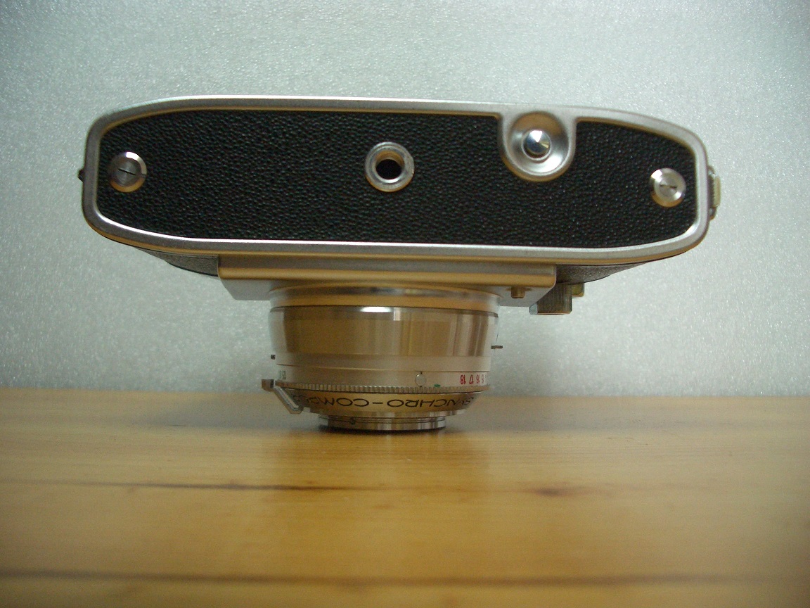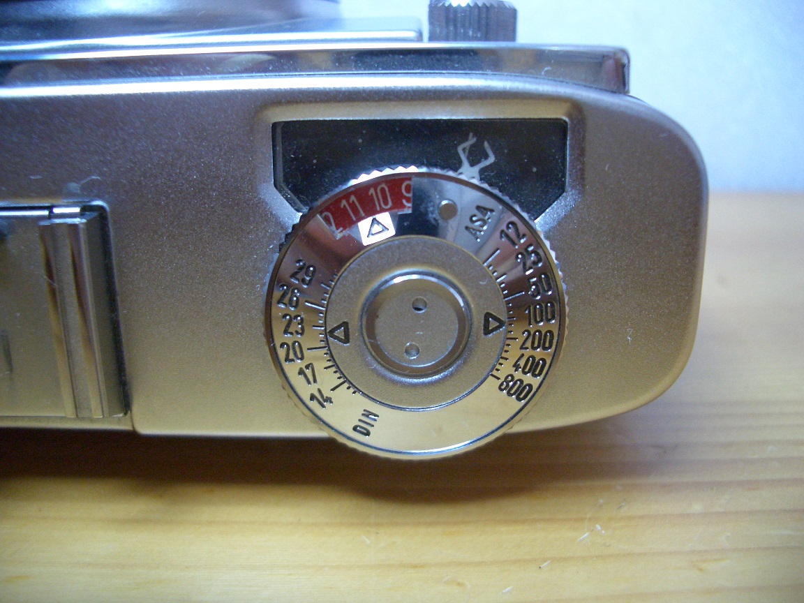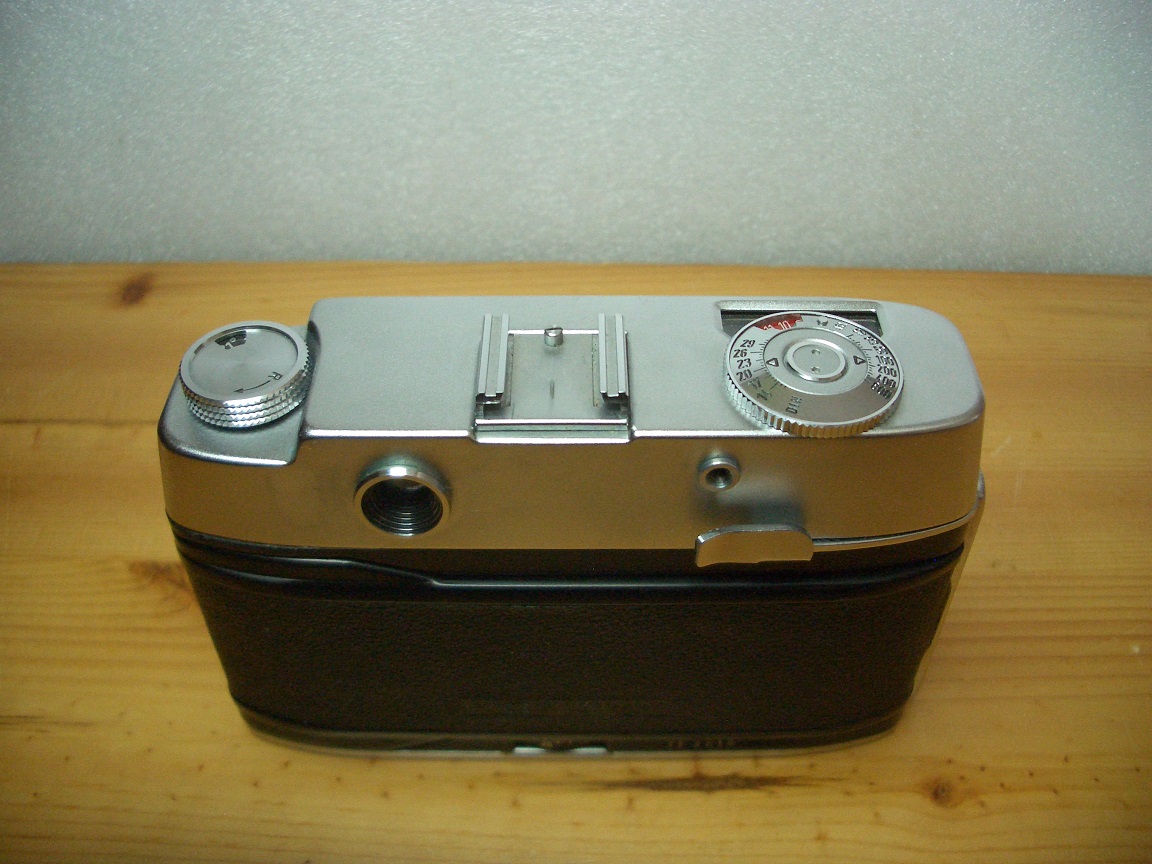 Oberseite: Filmrückspulrad mit Filmmerkscheibe, Blitzschuh ohne Mittenkontakt (PC-Buchse vorne rechts an der Objektivgrundplatte, Einstellrad für den Belichtungsmesser (darin Einstellmöglichkeit für die Filmempfindlichkeit), Anzeigefenster des Belichtungsmessers