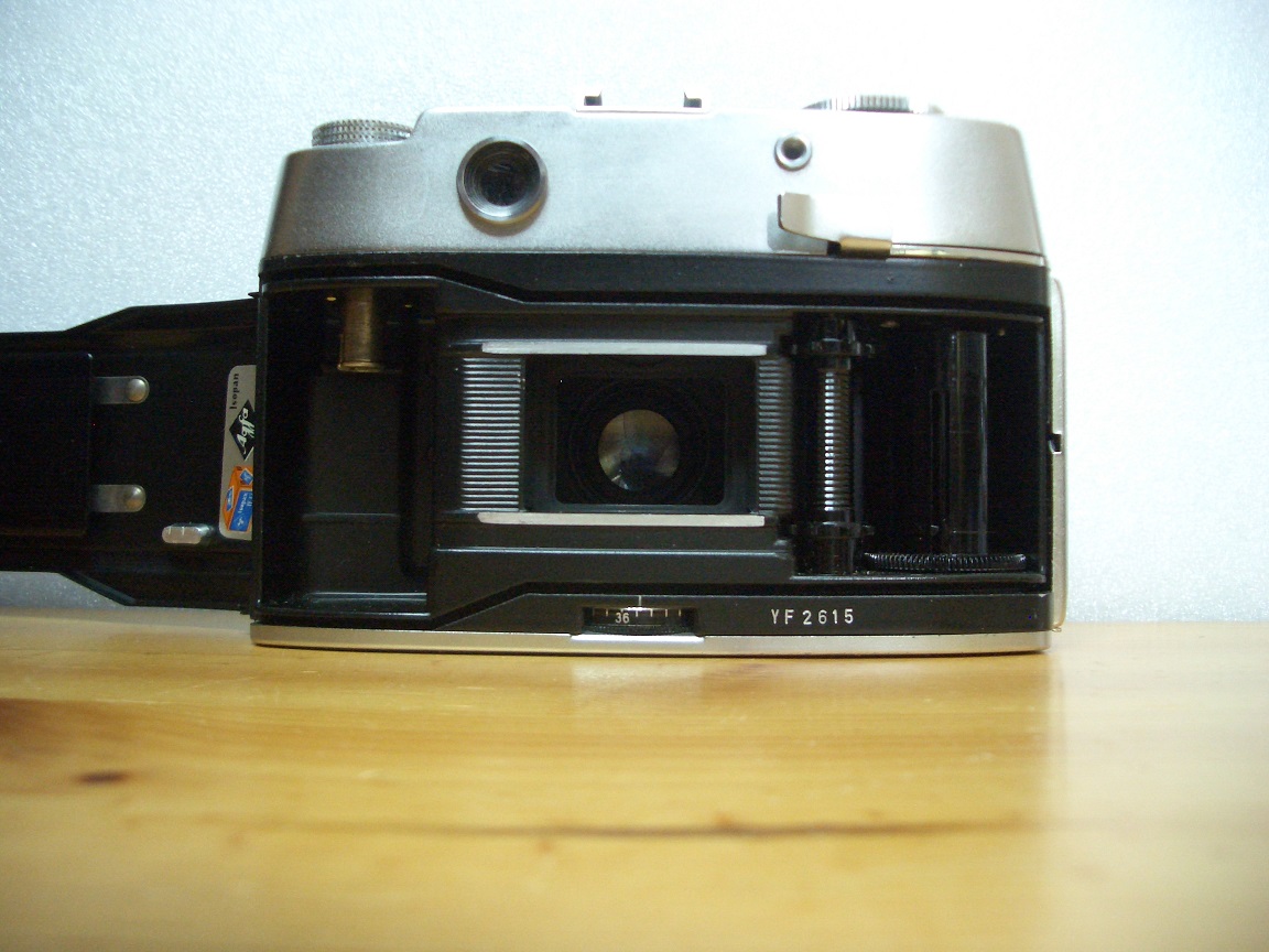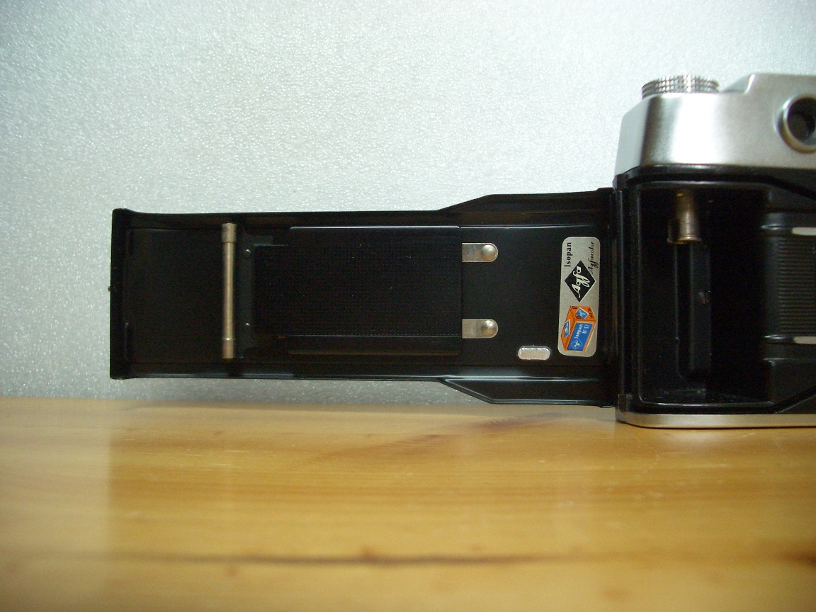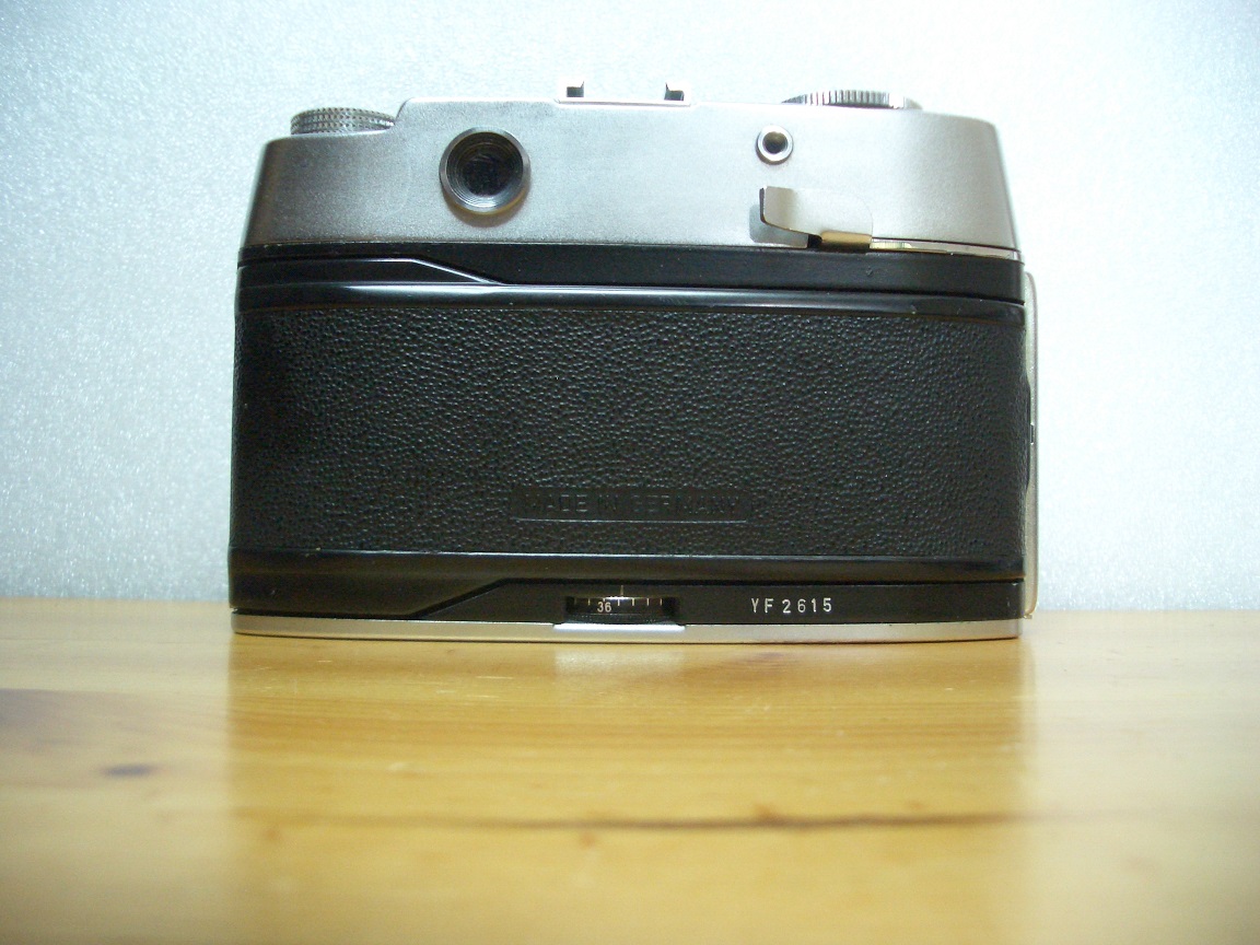 Rückseite: Sucher mit Mischbildanzeige, Schnellspannhebel, darüber Drahtauslöseranschluß, klappbare Rückwand mit Filmandruckplatte, Bildzählwerk, Seriennummer