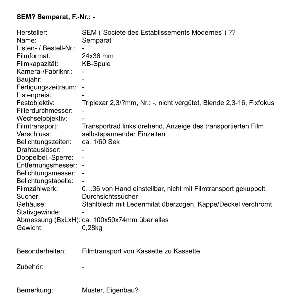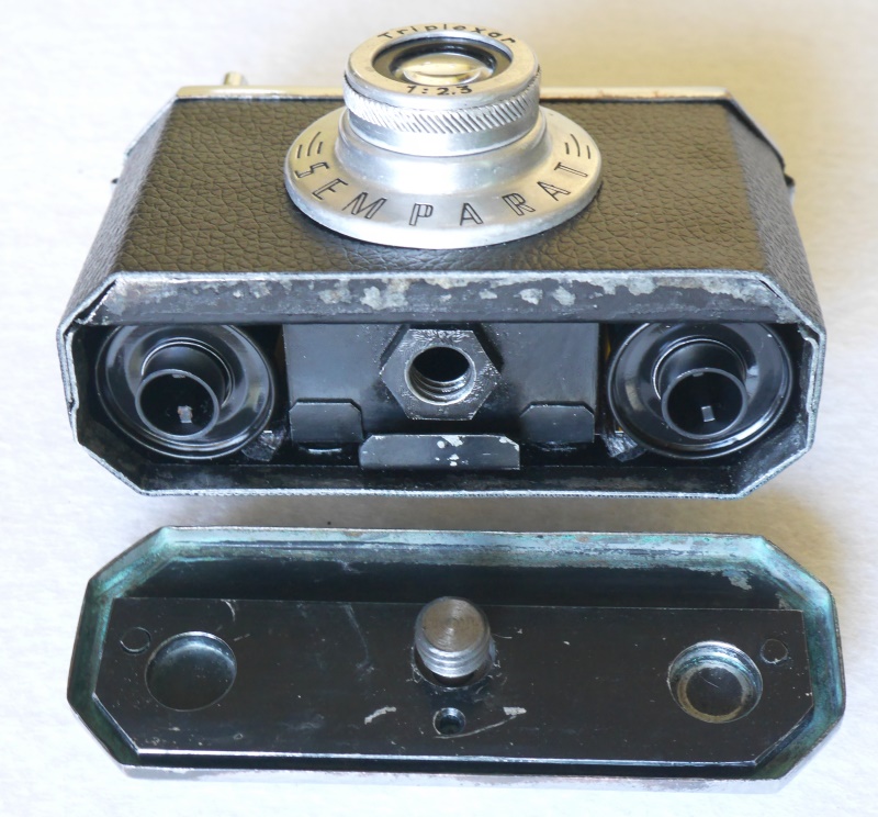 Das wäre auch meine Vermutung, dafür spricht insbesondere die sehr rustikale Verarbeitung. – In den einschlägigen Büchern von Patrice-Hervé Pont (SEM et les Semflex) und Bernard Vial (Histoire des Appareils Français. Periode 1940–1960) werden übrigens weder eine "Semparat" noch ein "Triplexar" erwähnt. SEM-Kameras (es gab einige einfache KB-Modelle) haben i.d.R. Orec-Verschlüsse. Eine gewisse äußere Ähnlichkeit mit der SEM "Kim" zeigen immerhin die verwendeten Sucher.