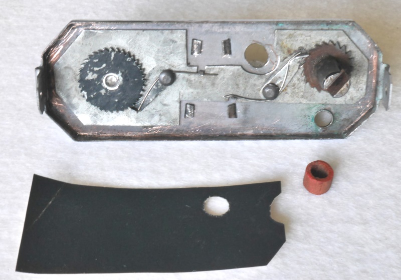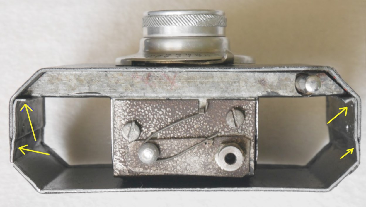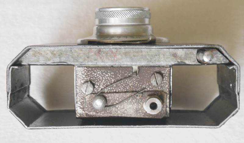 Innen sieht es nicht professionell aus, viel grobe Handarbeit, Bleche mit der Schere zurechtgeschnitten, Schrauben und Stifte mit der Zange gekürzt, Bohrungen nachgefeilt. An den Verschluss kommt man nicht heran, weil die Innenbleche z.T. verlötet sind, auch das Bildfenster ist nicht zugänglich.