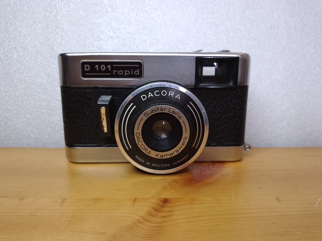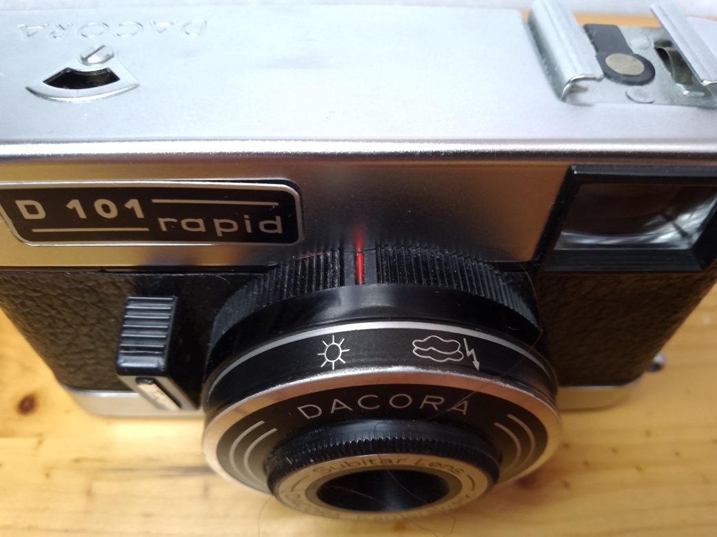 Hersteller: DACORA Kamerawerk, Reutlingen Modell: Dacora D 101 Rapid Typ: KB-Sucherkamera für das Rapid-System, 24x36, max. 12 Aufnahmen Baujahr: 1964 Verschluß: Einfachverschluß, 1/50 und 1/100 sec Blende: 11 Objektiv: Subitar 1:11/45 (auch Modelle mit Color-Subitar) Fokus: Fixfokus, 1 Meter bis unendlich Filmempfindlichkeit: über Kodierung an den Rapid-Patronen