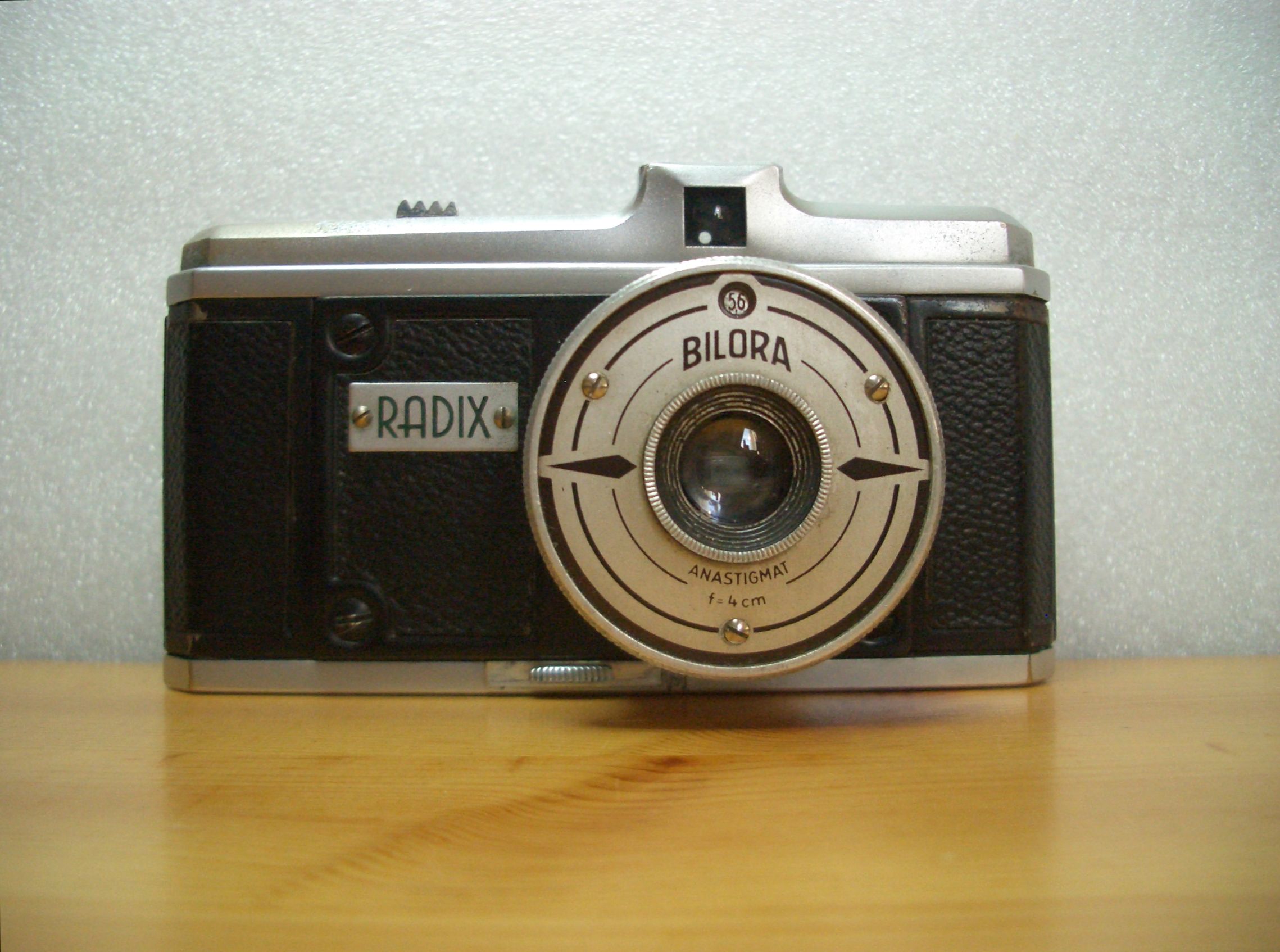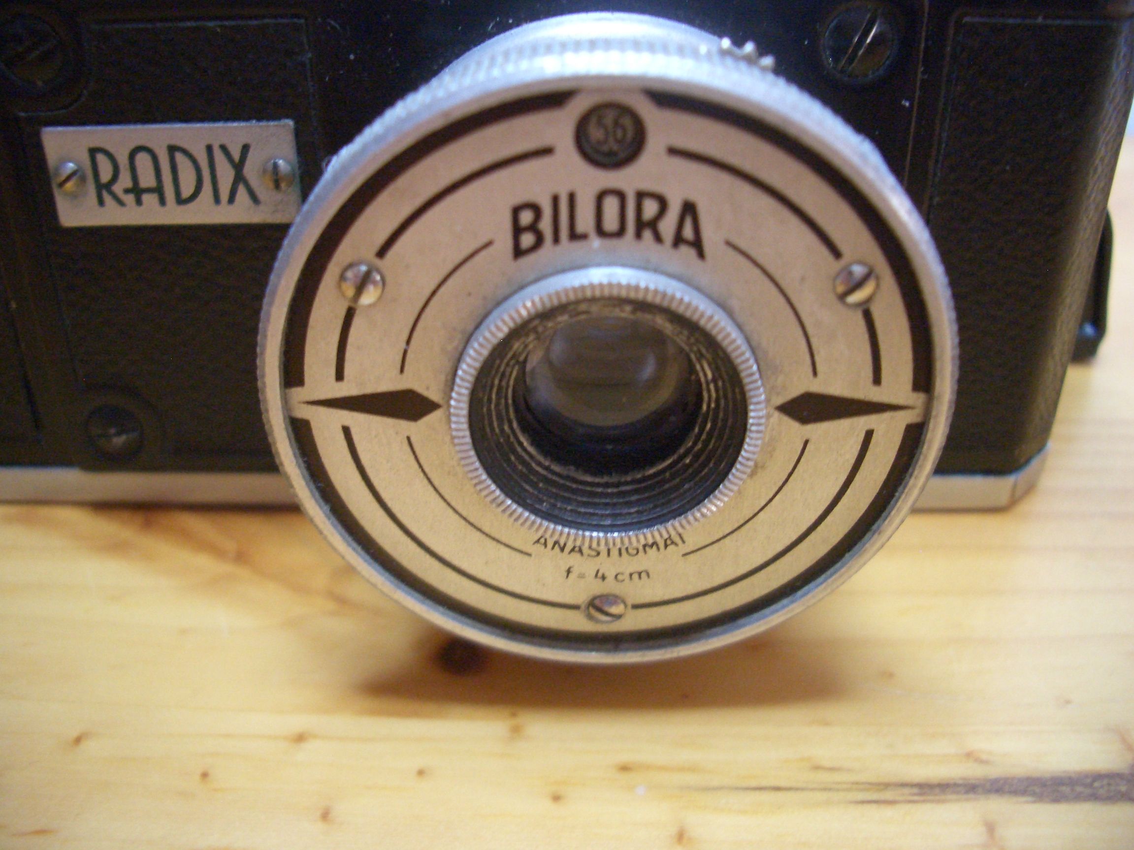 Hersteller: BILORA, Kürbi & Niggeloh, Radevormwald Modell: RADIX 1 Typ: KB-Sucherkamera für das AGFA-KARAT System, 24x24 mm, max. 16 Aufnahmen Baujahr: 1948 Seriennummer: 1215 Verschluß: Klappverschluß mit "T" und "M" 1/60 sec. Blenden: 5,6 - 16 Objektiv: Anastigmat, 1:5,6/4 cm Fokus: Fixfokus? Preis (1948): 58,-- DM