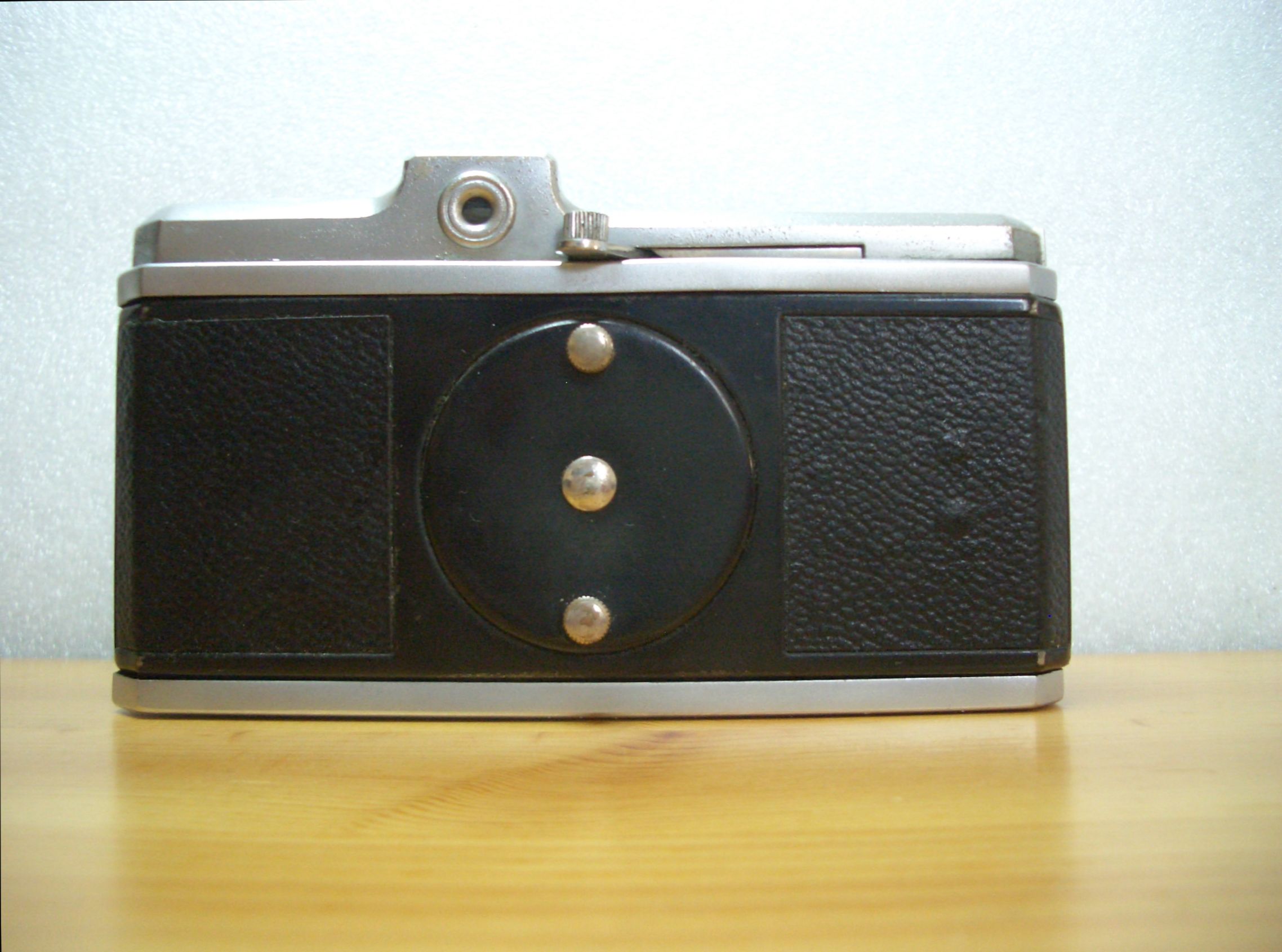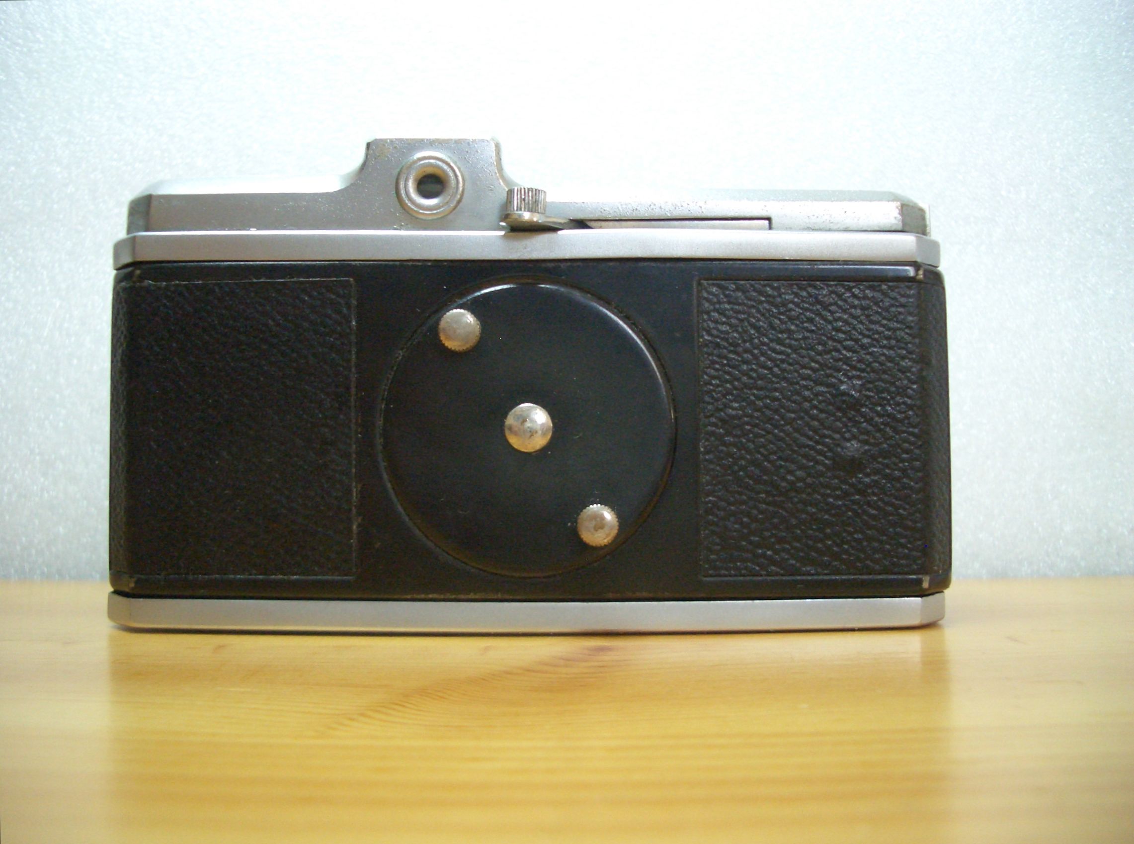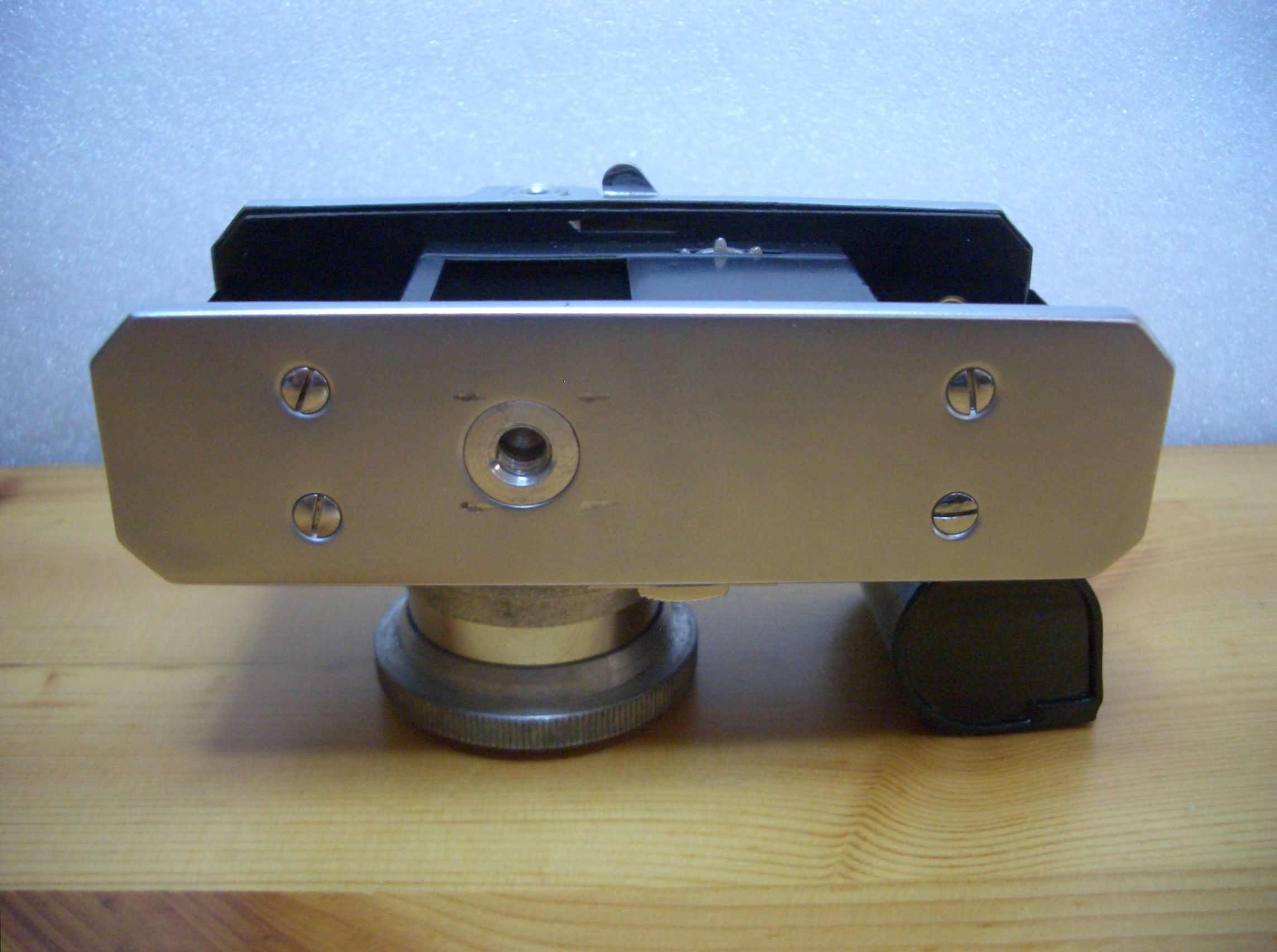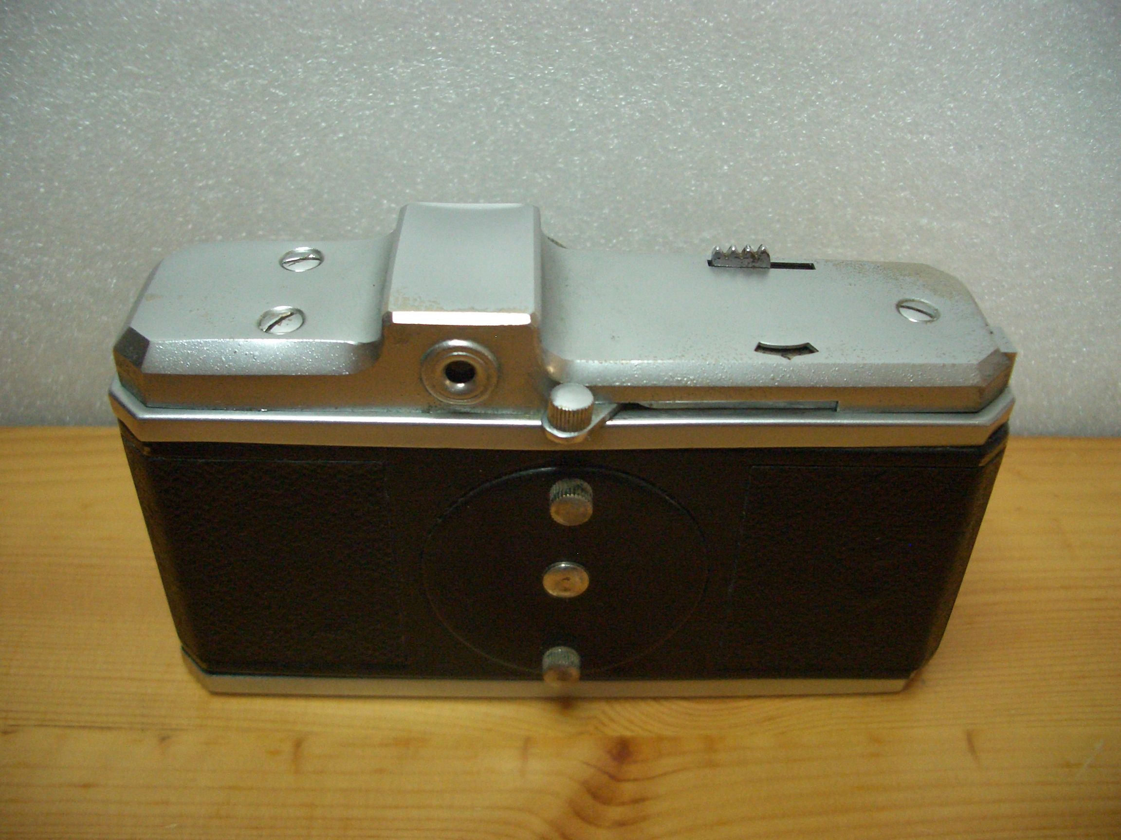 Trotz ihrer kompakten Abmessungen (LxBxH: 11,5 cm x 6,5 cm x 6,5 cm) ist die BILORA Radix mit einem Gewicht von ca. 450 Gramm eine solide Konstruktion. Technische Finessen sucht man allerdings vergeblich. Als Objektiv kommt ein einfacher Anastigmat mit einer Brennweite von 4 cm zum Einsatz. Diese erste Ausgabe soll über einen Fixfokus verfügen, erkennbar wohl an den beiden Punkten auf dem Tubus und der Frontplatte. Leider konnte ich da keine weiteren Angaben oder eine Anleitung im Netz finden. Spätere Exemplare weisen eine Entfernungseinstellung in drei Stufen von 1,2 Meter bis unendlich auf.
