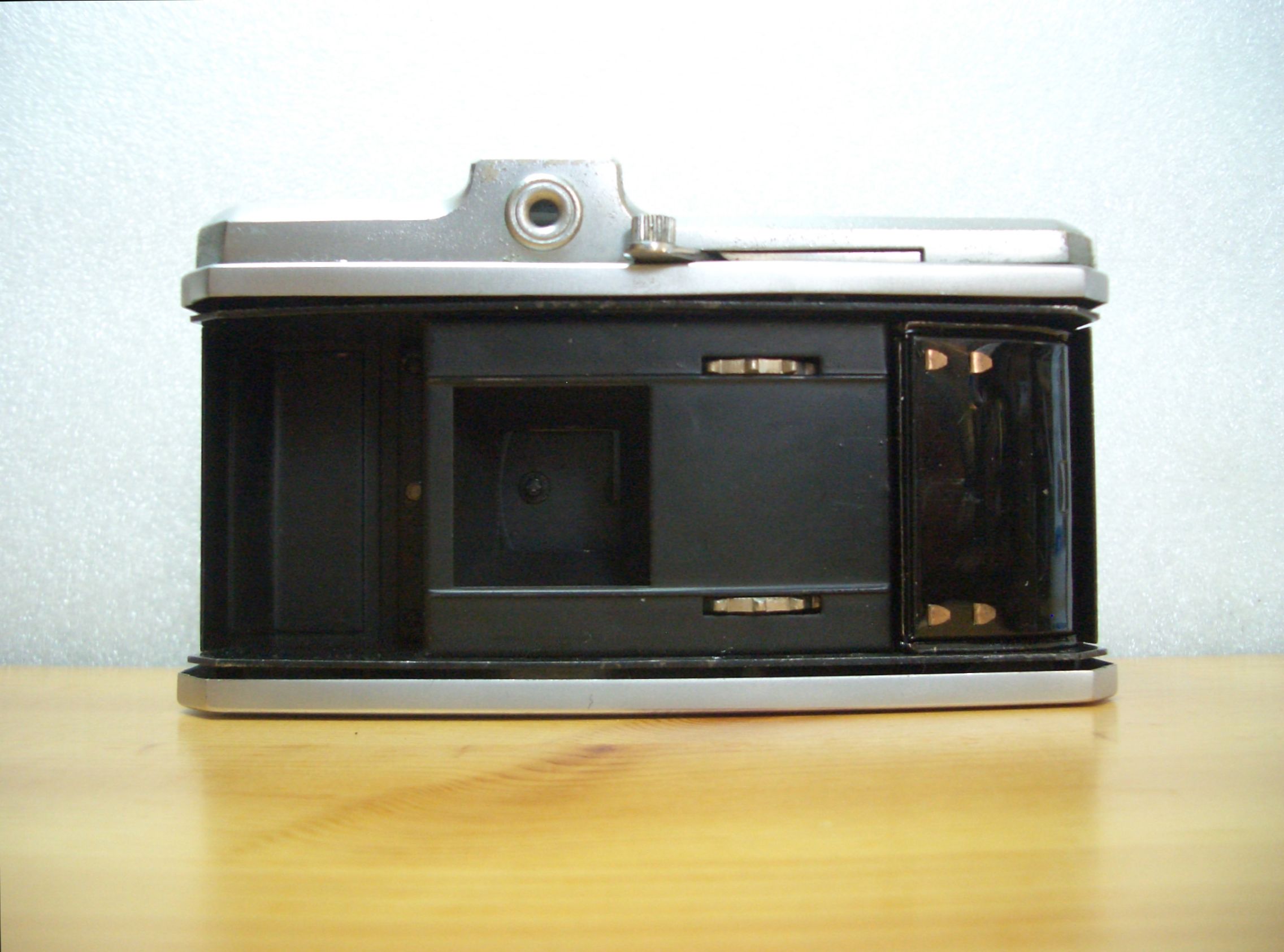 Rückseite: Sucher, Schnellspannhebel, Entriegelung für die komplett abnehmbare Rückwand mit Filmandruckplatte und zwei Andruckfedern für die KARAT-Filmpatronen