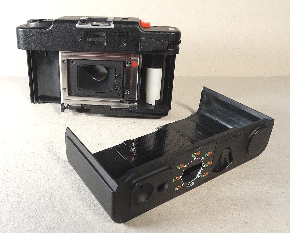 Durch die schützende Objektiv-Klappe ist die Kamera eine echte Hosentaschen-Kamera, da die Abmessungen sehr gering sind. Eine wirklich Immer-dabei-Kamera. Das Objektiv wurde einsatzbereit gemacht, indem oben vorn auf die Sperrklinke gedrückt wurde und dann die etwas vorspringende Objektivklappe in die Endstellung geschoben wurde.
