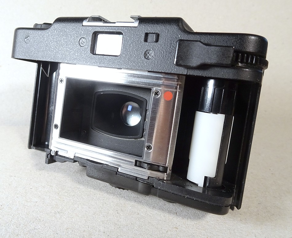 Filmtransport: Schnellspannhebel (muss doppelt aufgezogen werden), Rückspulkurbel mit Entsperrung. Kameraöffnung von unten.