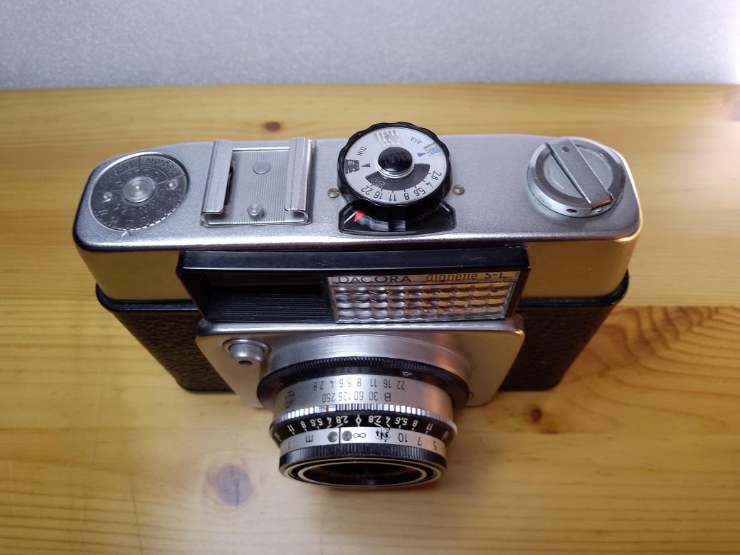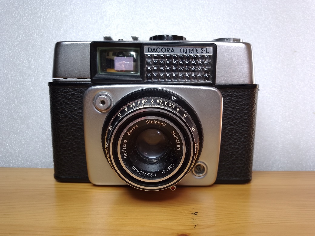 Hersteller: DACORA Kamerawerke, Reutlingen (Baden-Württemberg) Modell: DACORA dignette S-L Typ: KB-Sucherkamera mit Leuchtrahmen und ungekuppeltem, selenzellengesteuertem BERTRAM-Belichtungsmesser, 24 x 36 mm, max. 36 Aufnahmen Baujahr: 1963 Seriennummer: 217751 Verschluß: Gauthier PRONTOR 250 S, "B", 1/30 - 1/250 sec und Selbstauslöser Blenden: 2,8 - 22 Objektiv: Optische Werke Steinheil München Cassar 1:2,8/45 mm Fokussierung: manuell, ca. 0,95 Meter - unendlich oder über Symbole Gewicht: ca. 520 Gramm Neupreis: ?
