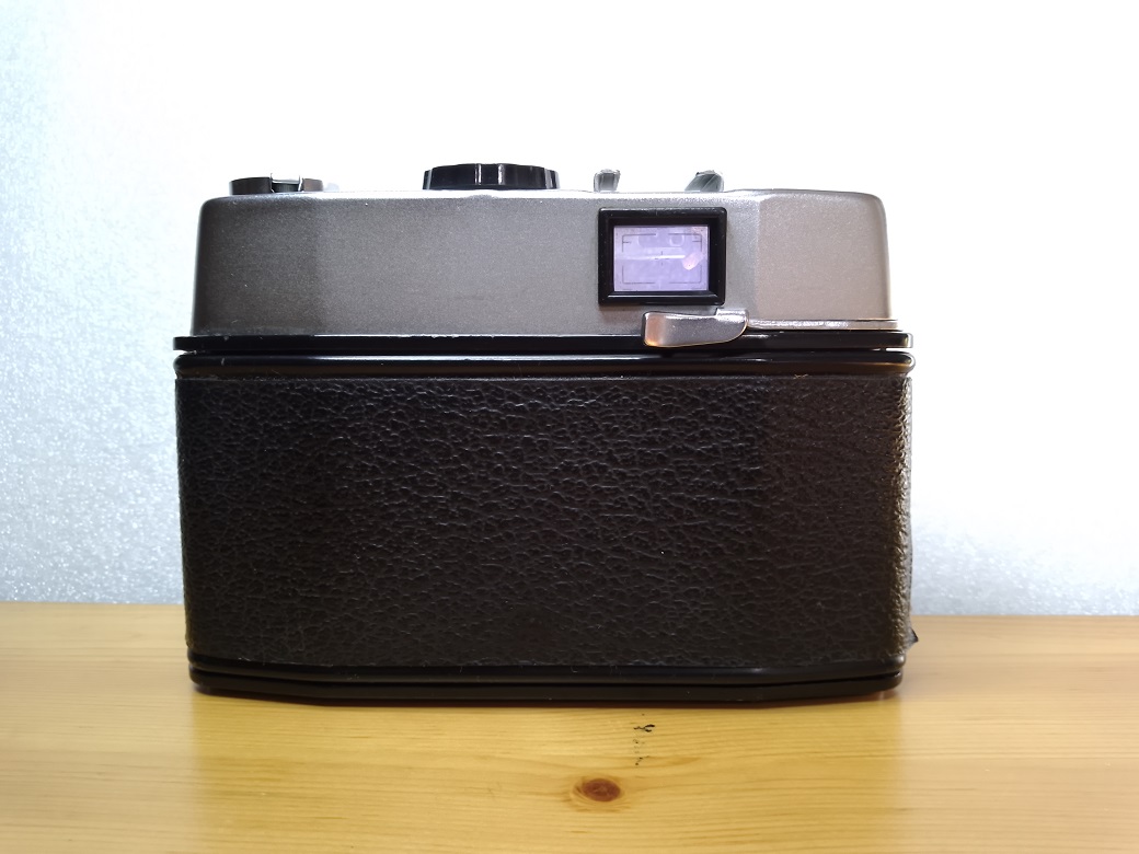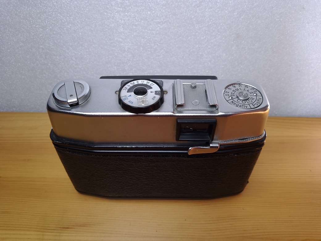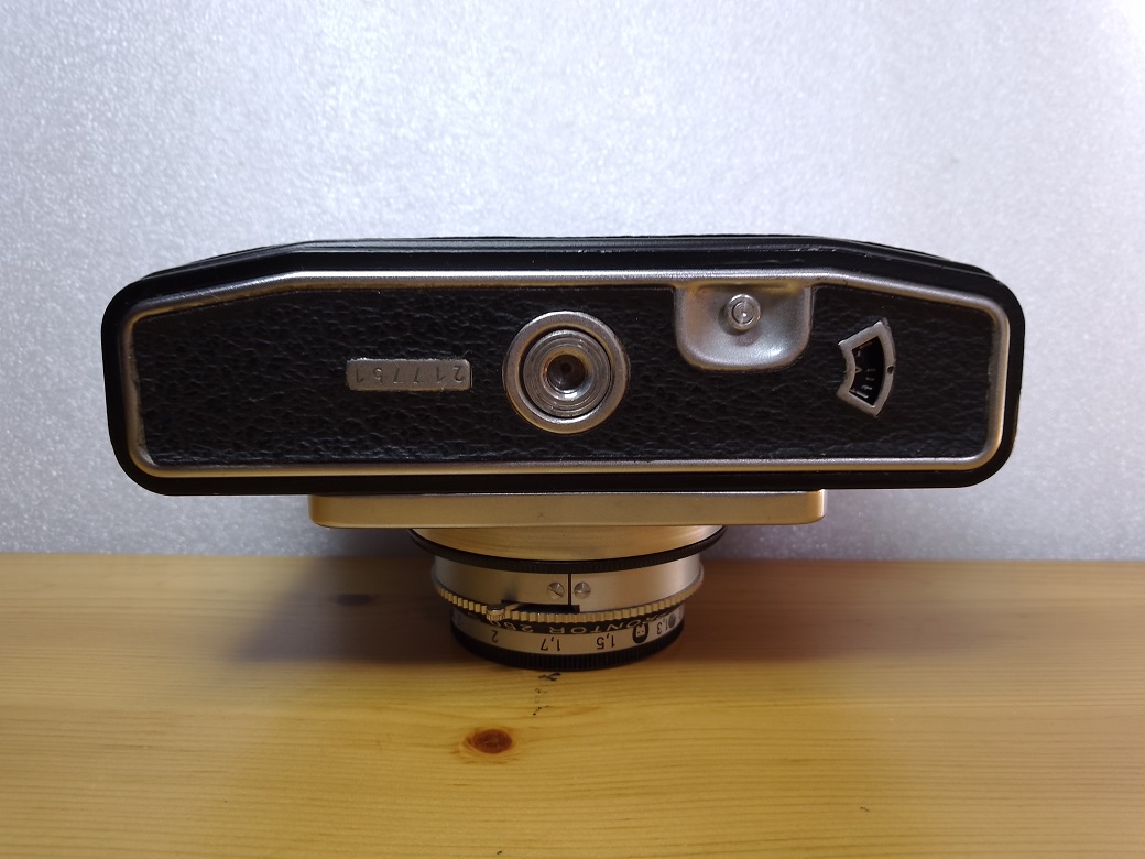 Oberseite: Filmrückspulkurbel, Bedienring für den BERTRAM-Belichtungsmesser (gleichzeitig Einstellung für die Filmempfindlichkeit), darüber Anzeige des Belichtungsmessers, Blitzschuh ohne Mittenkontakt (PC- Buchse vorne links an der Kamera), Filmmerkscheibe