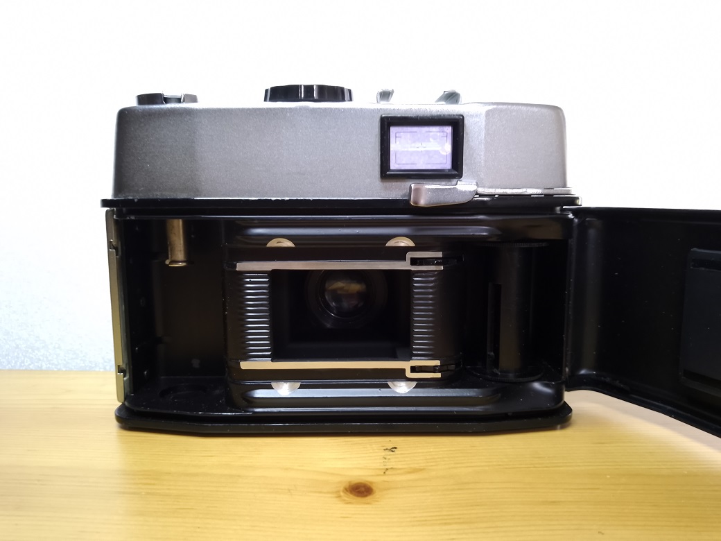 Rückseite: Sucher mit Leuchtrahmen, Schnellspannhebel, klappbare Rückwand mit Filmandruckplatte