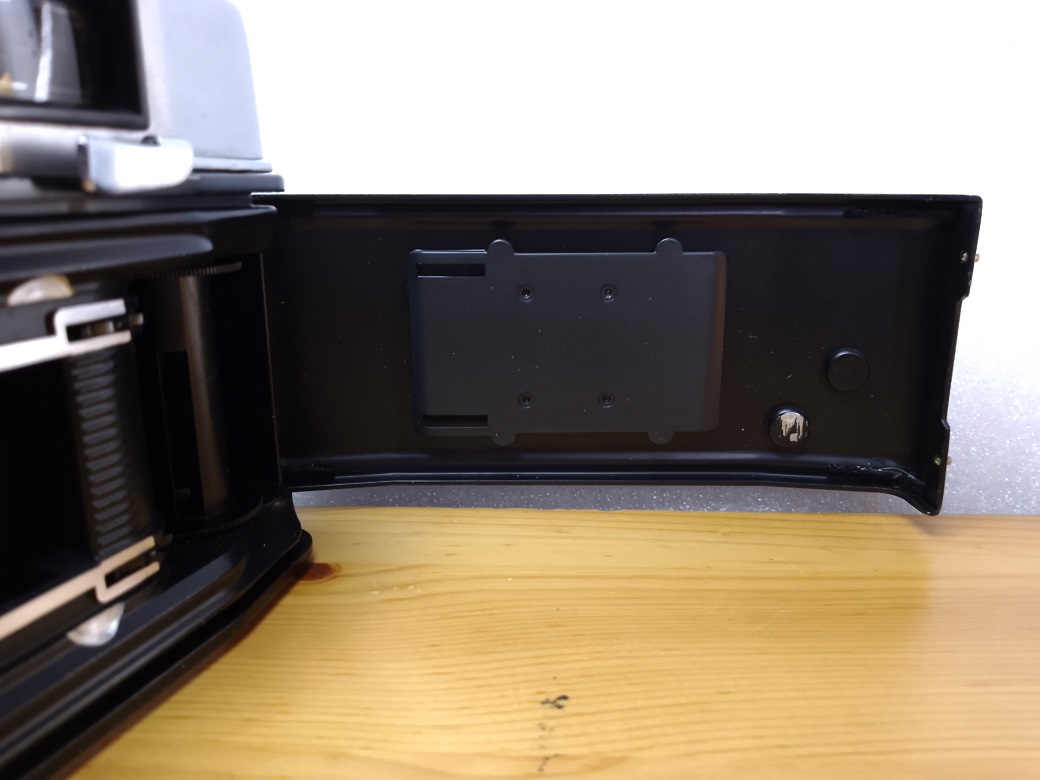 Unterseite: Seriennummer, Stativgewinde, Entsperrknopf für die Filmrückspulung, Bildzählwerk (selbstrückstellend)