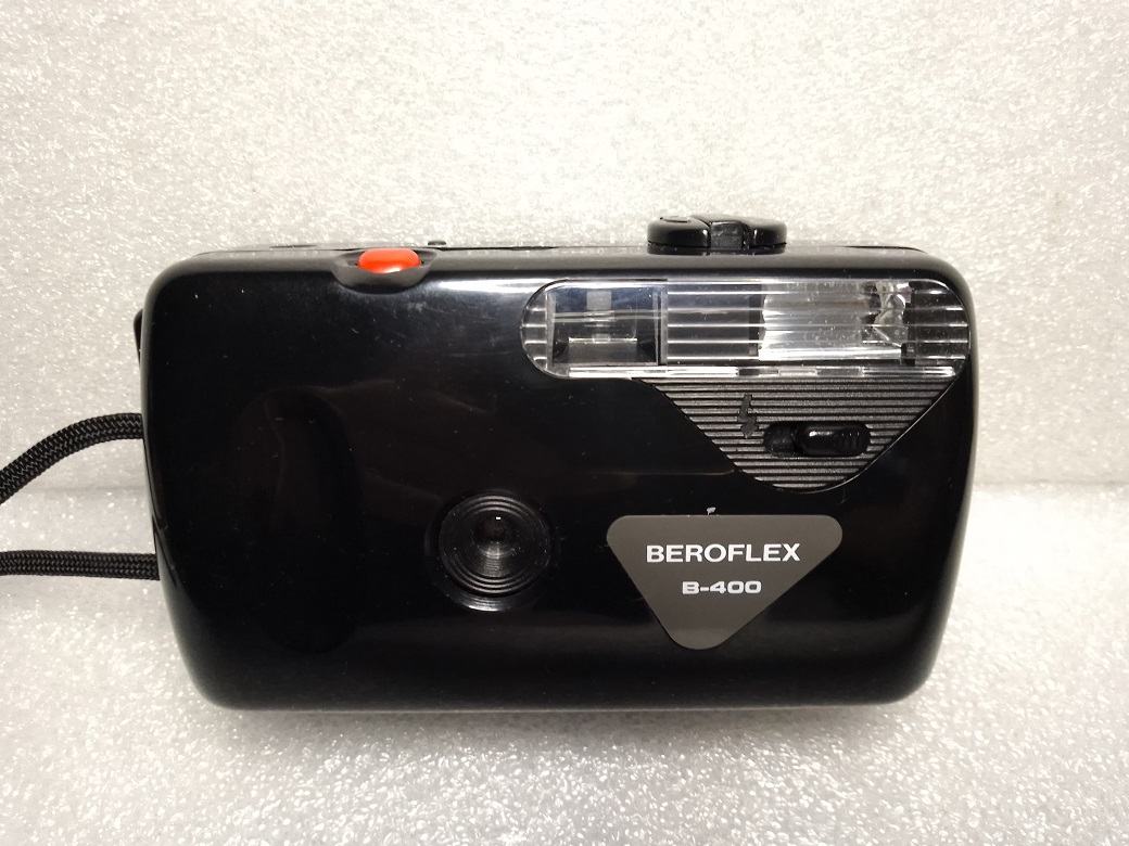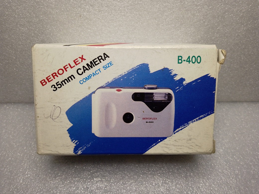 Hersteller / Vertrieb: ????, Taiwan / Beroflex, Berlin / Bad Kissingen Modell: Beroflex B-400 Typ: KB-Sucherkamera mit eingebautem Elektronenblitz, 24 x 36 mm, max. 36 Aufnahmen Baujahr: ?? Seriennummer: F854655 Verschluß: ??, vermutlich 1/25 - 1/30 sec Blende: vermutlich Blende 11 Objektiv (laut Bedienungsanleitung): 33 mm / 2 Linsenelemente Fokus: Fixfokus, vermutlich 0,9 Meter bis unendlich Stromversorgung (für den Blitz): 1 x 1,5 Volt AA Batterie
