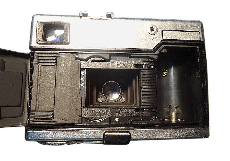 Filmtransport: Schwenkhebel. Aufbewahrungsteil mit spezieller Filmführung für den eingelegten Film. Der Filmrücktransport wird auch mit dem Spannhebel vollzogen, wenn vorn unter der "R"-Hebel eingerastet wird (schieben, heben).
