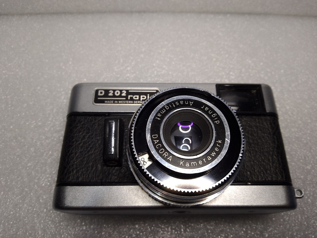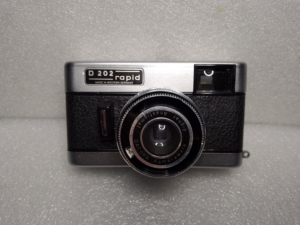 Hersteller: DACORA Kamerawerk, Reutlingen (Baden-Württemberg) Modell: Dacora D 202 Rapid Typ: KB-Sucherkamera für das Rapid-System, 24x36, max. 12 Aufnahmen Baujahr: 1964 - 1967 Verschluß: Einfachverschluß, 3 Geschwindigkeiten, 1/30 - 1/125 sec Blende: 5,6 Objektiv: Dignar Anastigmat 1:5,6/50 mm Fokussierung: manuell, 1,2 Meter - unendlich oder über Symbole Filmempfindlichkeit: über Kodierung an den Rapid-Patronen