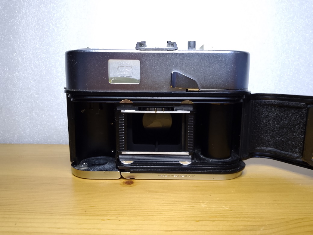 Rückseite: Sucher mit eingespiegelter Belichtungsmesseranzeige, Schnellspannhebel, klappbare Rückwand mit Filmandruckplatte