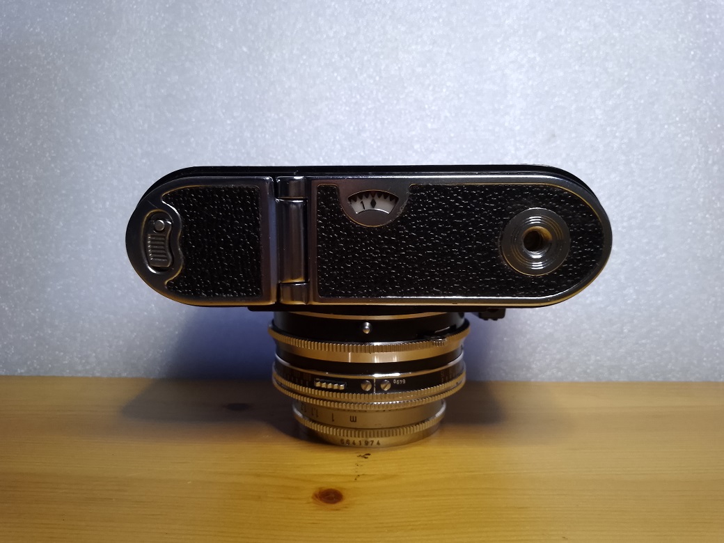 Auf dem Kameradeckel lassen sich ebenfalls Veränderungen feststellen: links befindet sich nun, statt des Rückspulrades, eine Rückspulkurbel, die wie gewohnt über einen Schieber an der Seite entriegelt wird. Eine Filmmerkscheibe ist nicht mehr vorhanden. Am Blitzschuh fällt sofort der Mittenkontakt auf, die PC-Buchse am Tubus entfällt, Blitzlichtgeräte mit Mittenkontakt werden bei der Vitomatic Ib direkt über den Blitzschuh angesteuert. War bei den beiden Vorgängerversionen auf dem Kameradeckel noch die Anzeige für den Belichtungsmesser zu finden wird diese nur noch in den Sucher eingespiegelt. Als wirkliche Neuerung werden auch Zeit- und Blendenwerke eingeblendet (siehe dazu die Bedienungsanleitung unter: https://cameramanuals.org/voigtlander_pd...tic_Ib_IIb_.pdf Seite 8 und 9). Zuletzt ist noch der formschön (meine persönliche Meinung) ausgeführte Lichteinfall für die Einspiegelung des Belichtungsmessers zu nennen.