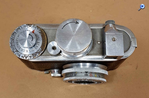 Verschluss: mechanischer Rotationsverschluss hinter dem Objektiv mit 1/2 bis 1/500 s in acht Stufen (1-2-5-10-20-50-100-300-500) und T, Einstellrad unten links neben Objektiv.