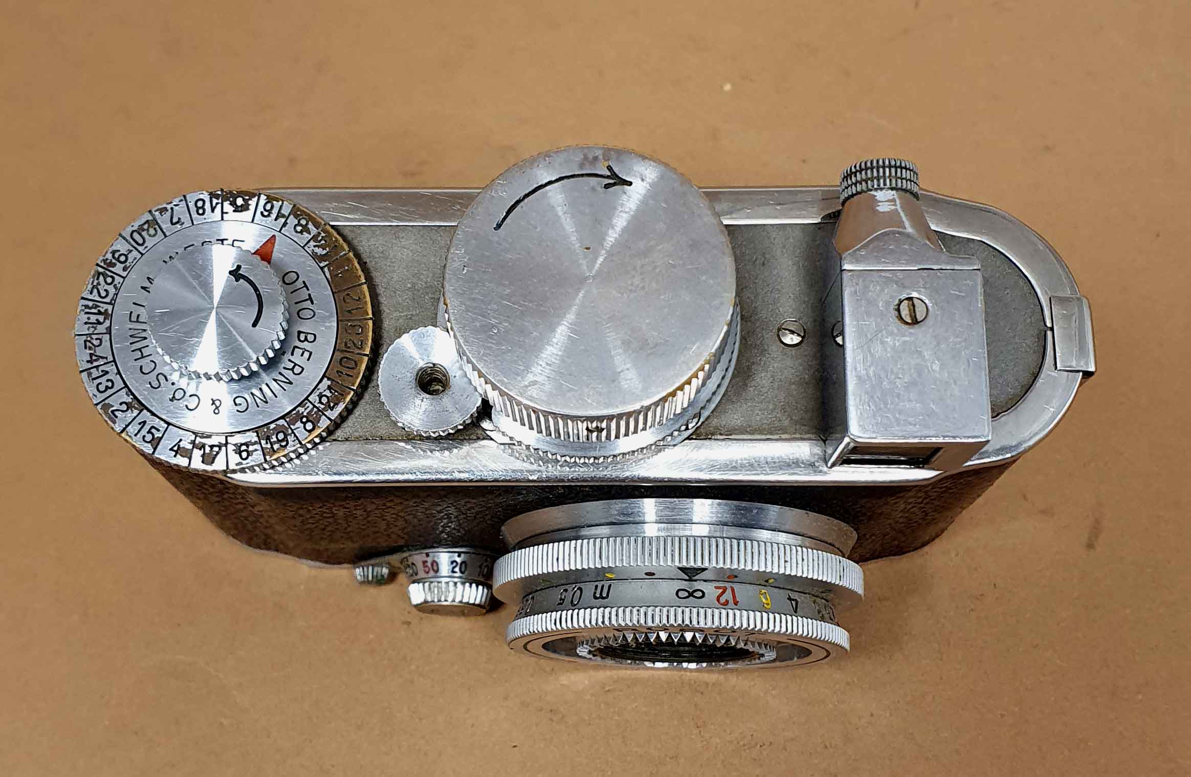Objektiv: Wechselobjektive mit Schraubgewinde M26, verschiedene Objektive in unterschiedlichen Brennweiten verfügbar, am vorliegenden Exemplar ein Carl Zeiss-Jena Tessar 2.8/30 mm, einschwenkbares gelbgrün-Filter