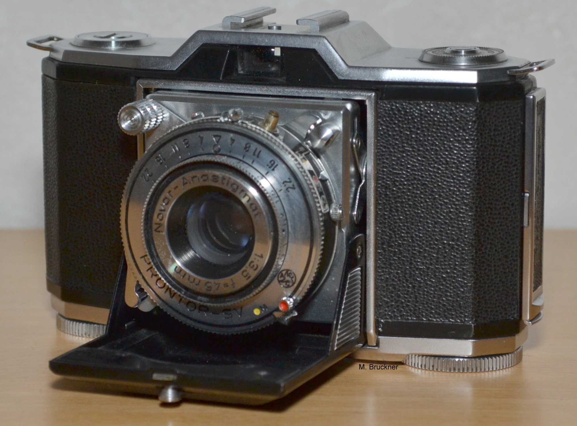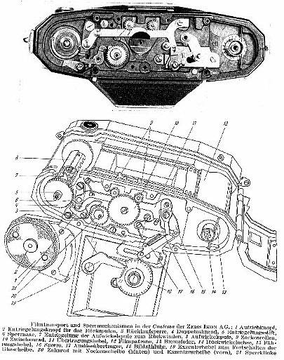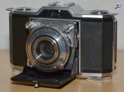 Dieser Entwurf des genialen Hubert Nerwin, der auch schon an der Contax II und III maßgeblich beteiligt war, sieht auf den ersten Blick recht schlicht aus, zeigt aber bei näherem Hinsehen einige Eigentümlichkeiten. So ist z.B. der Filmtransport auf dem Boden der Kamera mittels eines grossen Rändelrades untergebracht, ebenso der Filmrückspulknopf. Das Bildzählwerk fand dort auch noch seinen Platz. Die Doppelbelichtungssperre wird von den Zahnrädchen im Filmeingriff gesteuert, deswegen ist ein Auslösen nur bei eingelegtem Film möglich. (es sei denn man bewegt die Zahnrädchen bei geöffneter Rückklappe per Hand) Der Verschluss wird am ausklappbaren Objektiv gespannt, ausgelöst durch einen Hebel daneben. Blenden- Zeit- und Entfernungseinstellung sind von hinten bis vorn am Objektiv gestaffelt. Ausgeklappt wird jedoch nicht durch Federkraft wie z.B. an der 6 X 6 Ikonta, sondern per Hand durch einen winzigen Anfassknopf. Völlig abstrus ist das Stativgewinde angebracht: Es sitzt auf der Deckkappe rechts oben, durch eine Schlitzschraube verdeckt. In der Mitte der aberwitzig kleine Sucher, links daneben die Filmmerkscheibe.
